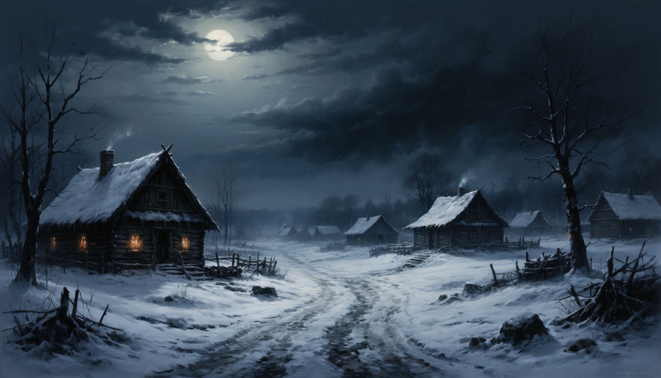 По тропе охотник дошел до небольшой деревушки. На единственной прямой улице уже никого не было, но, несмотря на поздний час, окна почти во всех домах горели мягким и ровным светом. Периодически в оконцах мелькали фигуры, которые быстро прятались, завидев дланника.