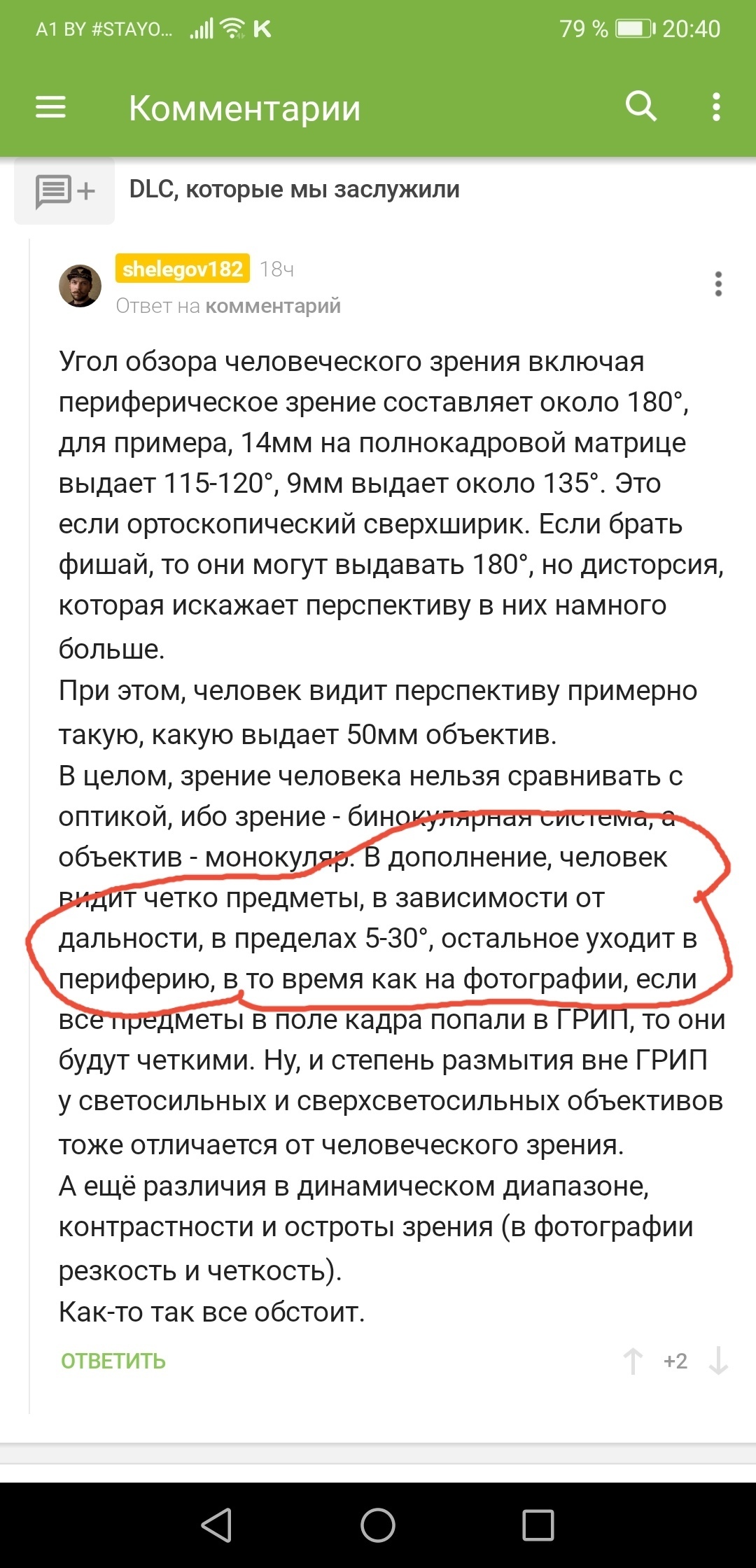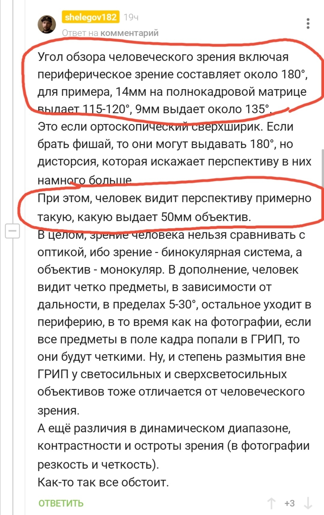 Сравните то, что я выделил с углом обзора 50мм объектива, получите как раз близкие значения. Только вы почему-то не учитываете периферическое зрение, ведь человек смотрит на мир не участком в 5-30°, а всем углом обзора обоих глаз. ;)