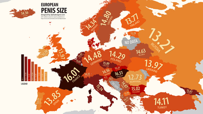 Жители Великобритании в среднем имеют пенисы по 14 см, французы — 13,5 см. Средняя длина члена в Италии и Нидерландах — 15,74 сантиметра, в Швеции — 14,98 см, в Греции — 14,73 см, в Германии — 14,48 см.