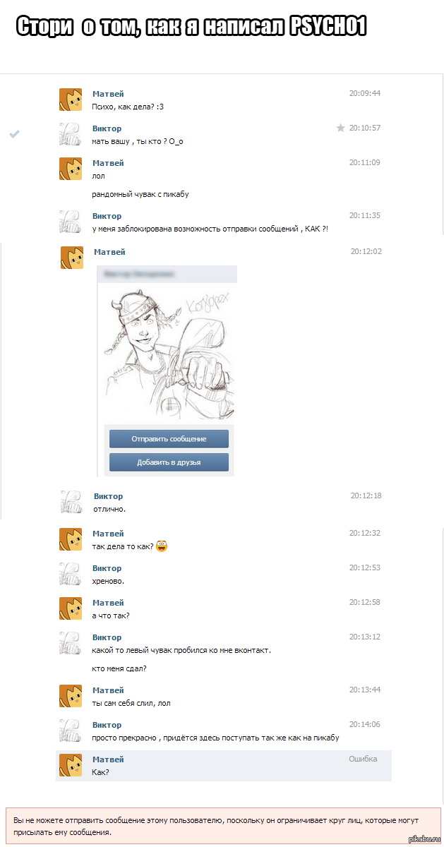 1613 Centik Длиннопост про злого PSYCHO1. 11 лет назад Я нашёл в комментах его айди и решил спросить, как у него дела :С [моё] Длиннопост Переписка ВКонтакте Psycho1