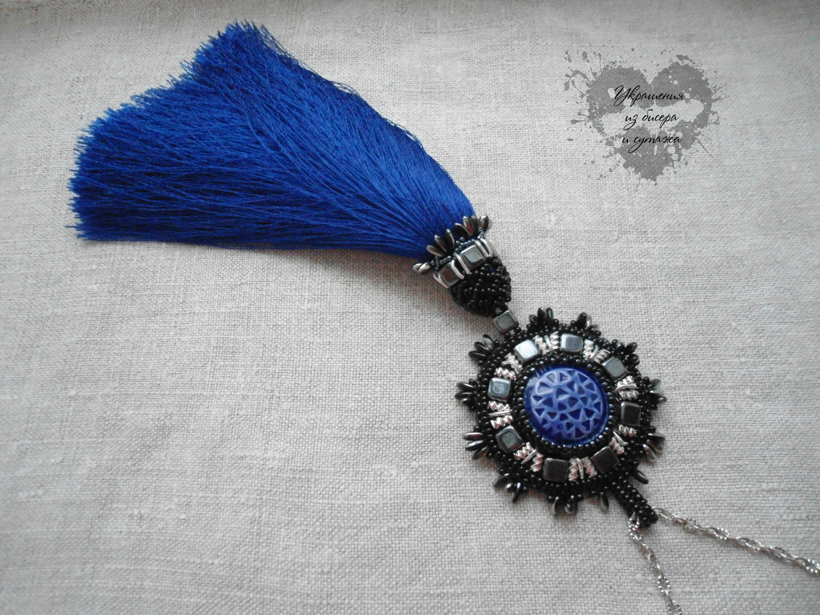 1. Кулон с пышной кистью и керамическим кабошоном.