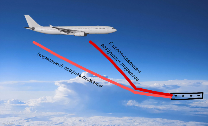 Сначала погасил скорость. Потом, когда диспетчер дал снижение, ставишь малый газ, разгоняешься, дергаешь рычаг воздушного тормоза и самолет камнем летит вниз, догоняя нормальный профиль снижения.