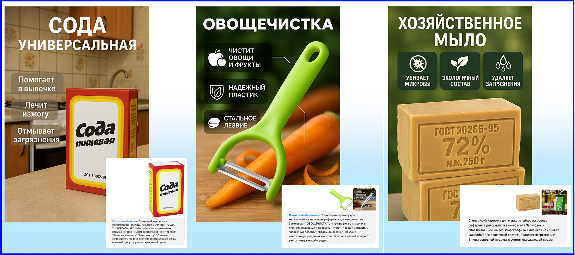 Я прикрепил к запросу фото продукта и пример оформления карточки, которая мне нравится, а дальше добавил промт: