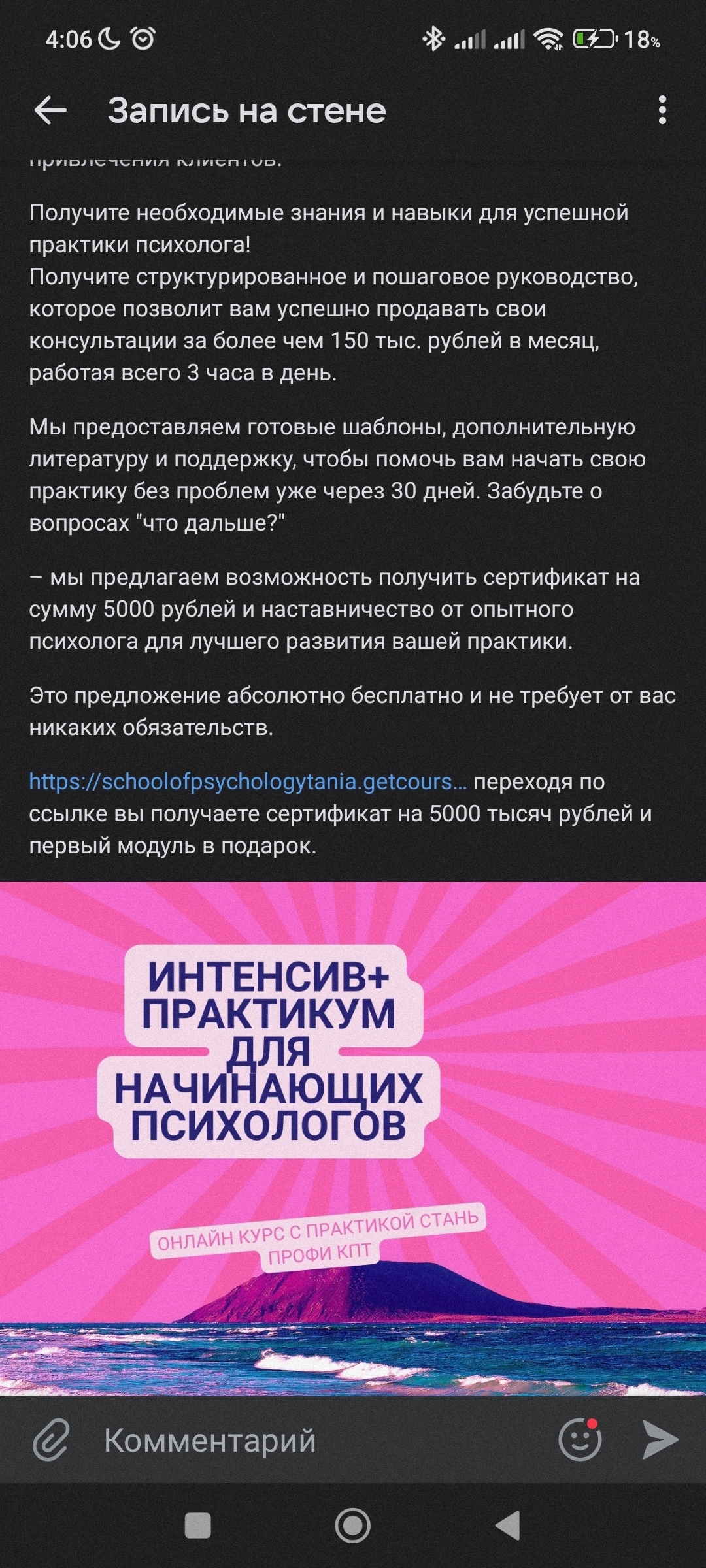 Я помогаю начинающим психологам идти путь от 0 до профессионала уже как опытный психолог знаю многое о рекламе, о клиентах и конечно о личных переживаниях. Группа о продвижении, знаниях и консультирование для всех кто начинает свой путь в психологии.
