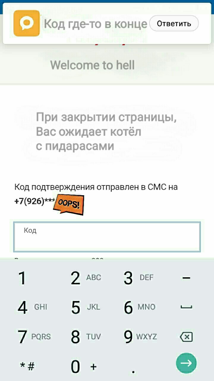 TacticalBeard 6 лет назад Для них есть отдельный котёл Меня одного бесит, когда при регистрации где-либо требуется код подтверждения, но, чтобы ввести его, нужно закрыть браузер (открыть смс), потому что сам код находится в конце сообщения?! Надеюсь, при регистрации в аду их будет ждать что-то подобное [моё] Бесит Отдельный котел Длиннопост