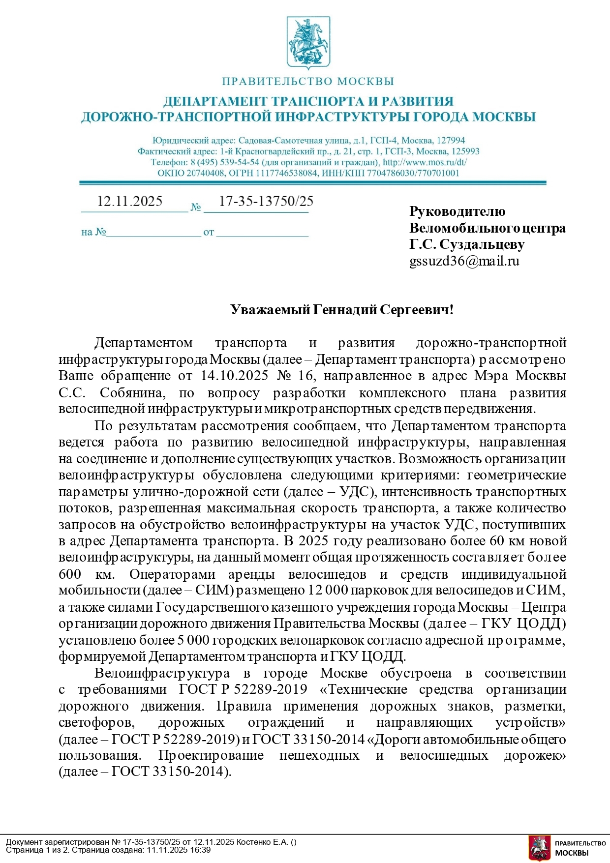 В ответ на письмо Мэру Москвы Сергею Семеновичу Собянину от корреспондента «ЭкоГрада», руководителя «Веломобильного центра Москвы» Геннадия Суздальцева о необходимости развития в Москве вело-транспортного и веломобильного движения заместитель руководителя Департамента транспорта и развития дорожно-транспортной инфраструктуры города Москвы Владимир Макаров сообщил: «Департаментом транспорта ведется работа по развитию велосипедной инфраструктуры, направленная на соединение и дополнение существующих участков». Письмо подписано электронной подписью.