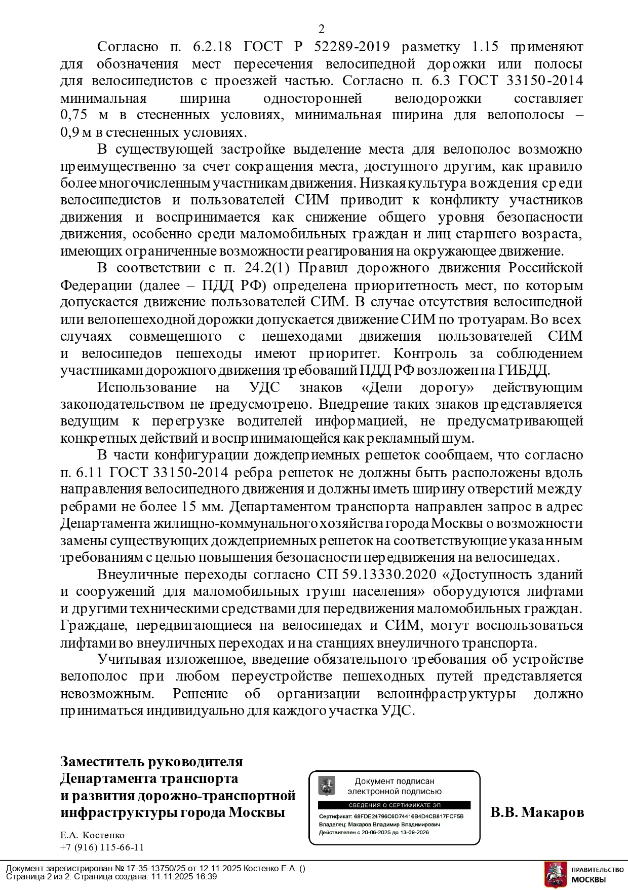 «Низкая культура вождения среди велосипедистов и пользователей СИМ приводит к конфликту участников движения и воспринимается как снижение общего уровня безопасности движения, особенно среди маломобильных граждан и лиц старшего возраста, имеющих ограниченные возможности реагирования на окружающее движение», - сообщил в письме Геннадию Суздальцеву Заместитель руководителя Департамента транспорта и развития дорожно-транспортной инфраструктуры города Москвы Владимир Макаров. Письмо подписано электронной подписью.