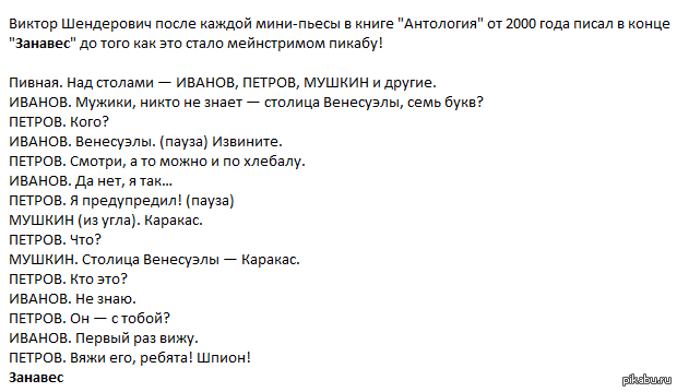 YanM 11 лет назад Для тех у кого "Занавес" Виктор Шендерович после каждой мини-пьесы в книге "Антология" от 2000 года писал в конце "Занавес" до того как это стало мейнстримом пик Виктор Шендерович Еврейский анекдот