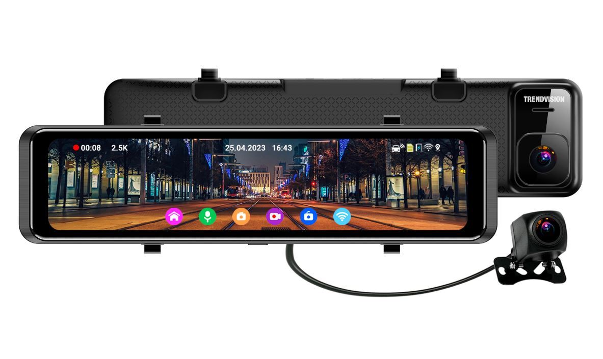 Начнем с форм-фактора зеркал-накладок. EasyDrive 2K Wi-Fi Dual предлагает предельно широкие 170 градусов с фронта и нормальные 120 градусов с тыла. Задний модуль — внешний, а потому логичной функцией является парковочный ассистент. Взаимодействовать с устройством предстоит через 10-дюймовый сенсорный экран с IPS-матрицей.