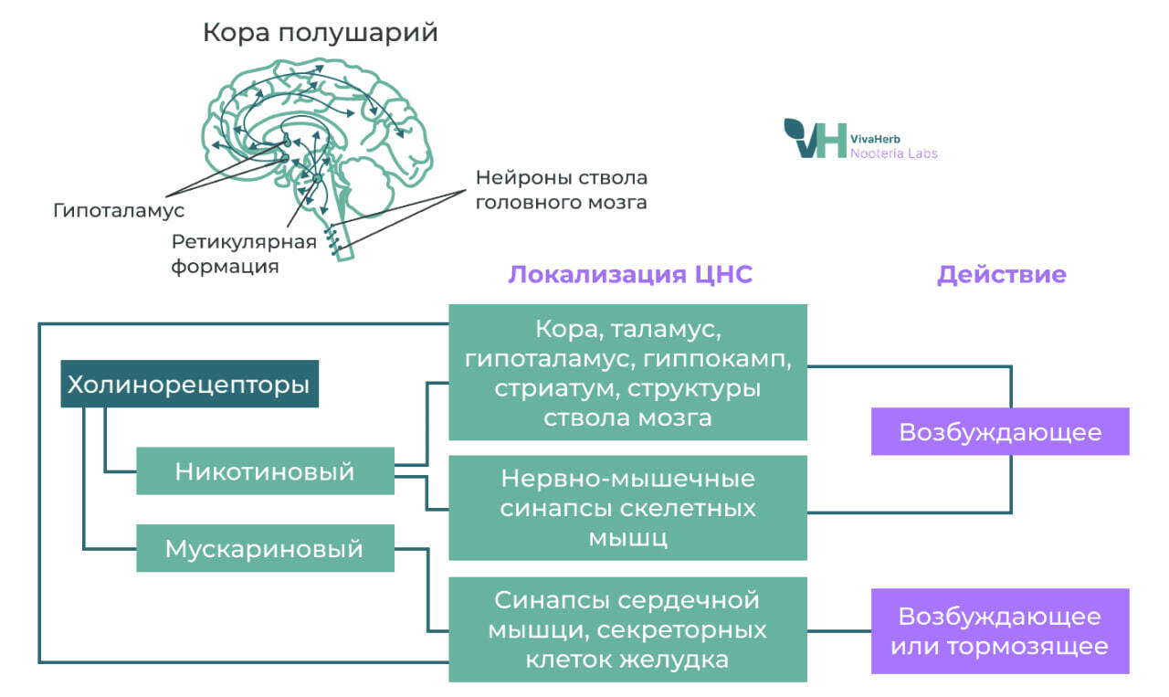 Основная роль ацетилхолина – обеспечение процесса фиксации новой информации. При его недостатке, из-за изменения баланса нейромедиаторов, нарушается процесс перевода кратковременной памяти в долговременную. Хотя роль ацетилхолина как нейротрансмиттера хорошо известна, все больше данных указывает на то, что ацетилхолин является вездесущей молекулой, которая регулирует основные клеточные процессы, то есть весь цикл жизни клетки.