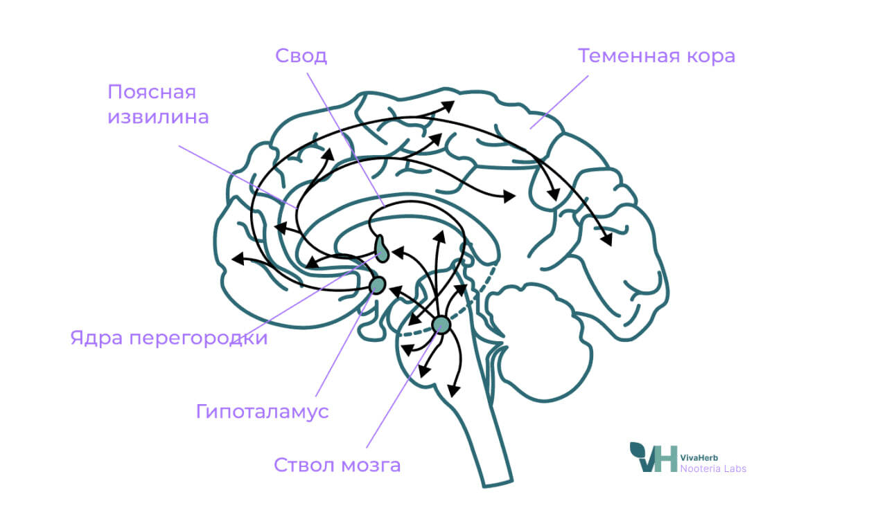 Холинергическая система – регулятор внимания, временной и декларативной памяти, обучения и других когнитивных процессов. Нейроны этой системы расположены в самых разных участках мозга и участвуют в формировании циркадных ритмов, инициировании фазы быстрого сна. Ее активность максимальна в период бодрствования и уменьшается во время медленноволнового сна.