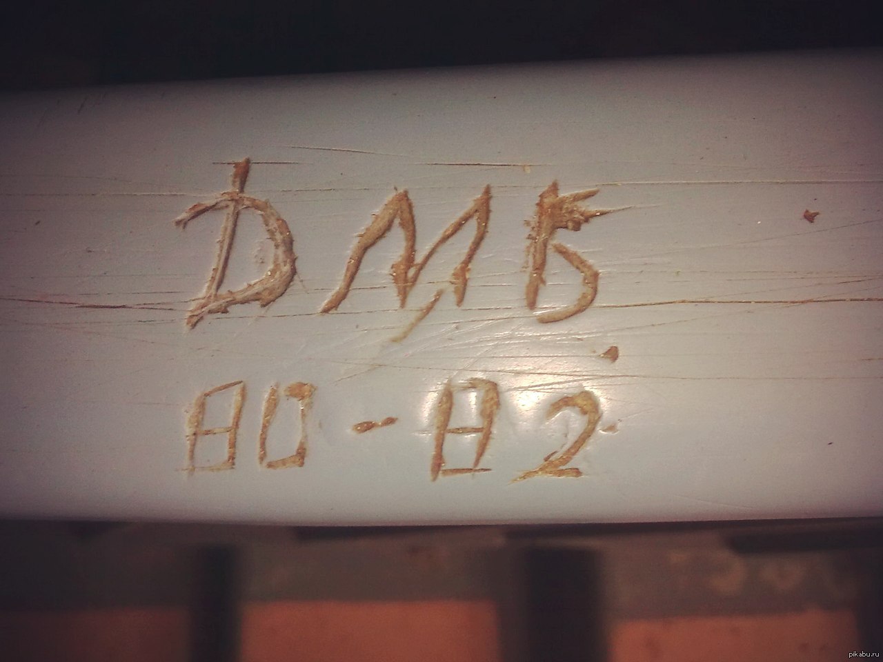 4 Duval ДМБ 80-82 11 лет назад Частичка прошлого, дожившая до наших дней. Надпись, вырезанная на перилах военного госпиталя в поселке Селятино, Наро-Фоминского района Московской области. [моё] Армия История Демобилизация