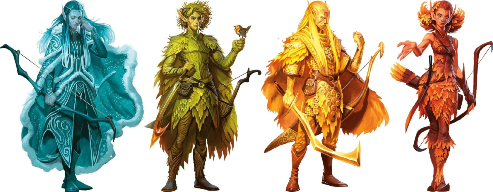 Эладрины – это эльфы чьей родиной является Страна Фей, царство красоты, непредсказуемых эмоций и безграничной магии. Каждый эладрин отражает одно из четырёх времён года, что выражается их цветовой гаммой, соответствующей сезону, которая так же влияет на настроение эладрина: