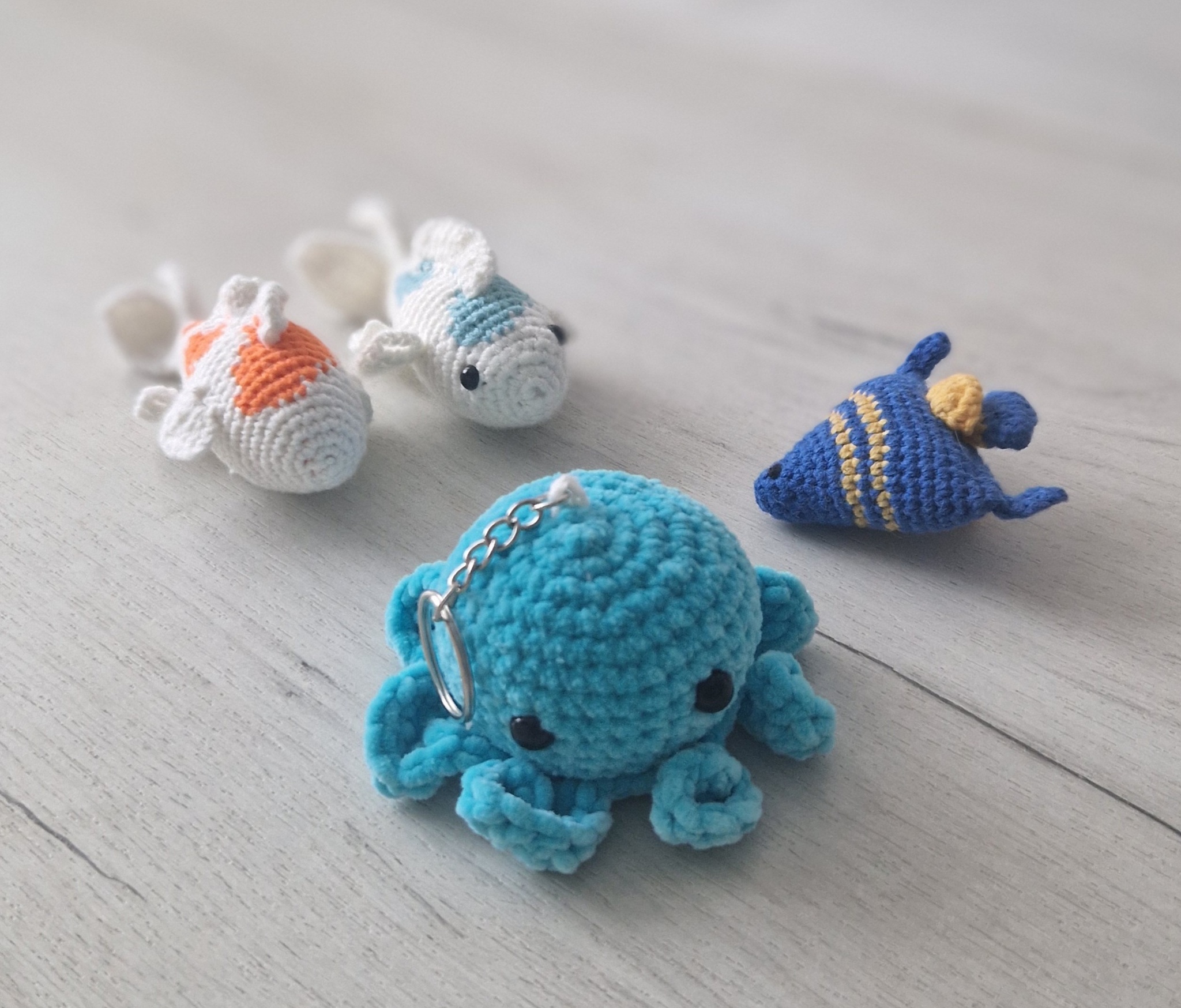 По просьбе дочке связала ей рыбок, заодно попробовала сделать брелки осьминожки. Хочу сделать ещё поменьше.