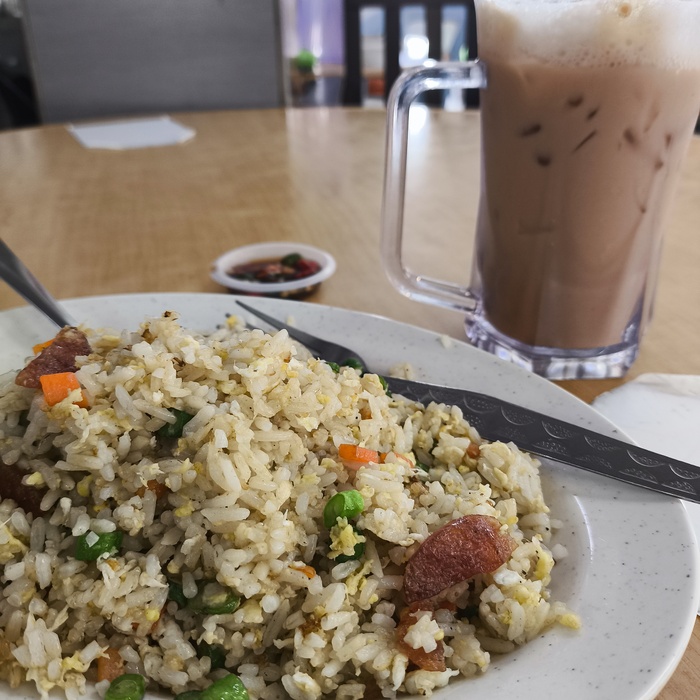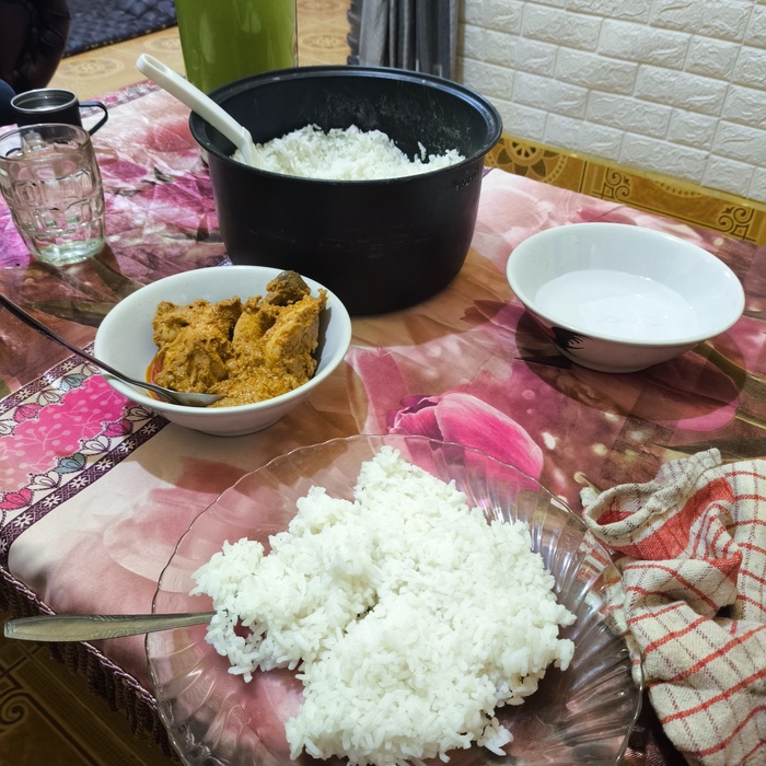 Поужинали рисом с очень острой курицей, Альфи назвал это блюдо ренданг.