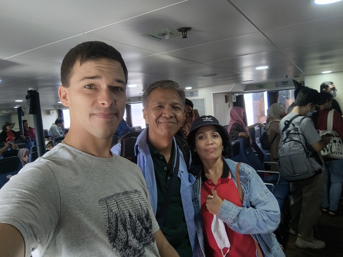 Не успел я сойти на берег, как познакомился с местными - Элен и Генри. Они подловили меня в очереди на выход (сначала долго выгружают багаж). Мы немного поговорили о местной жизни. Заметил, что женщины на пароме почти не покрывают голову, как в той же Малайзии.