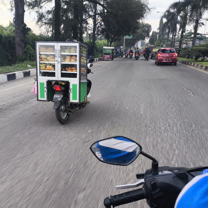 Разузнал у Альфи подробнее про его работу. Всё оказалось куда интереснее, чем я ожидал. Он зарабатывает тем, что собирает листья кетапанга, которые широко применяются в медицине и аквариумистике по всему миру. Причем никаких ферм нет, он просто ездит по паркам в черте города и ищет листья в хорошем состоянии. 1 килограмм таких листьев стоит около 70$, в день ему удается собрать из примерно на 30$. Мои представления об индонезийских зарплатах несколько изменились. Рад!