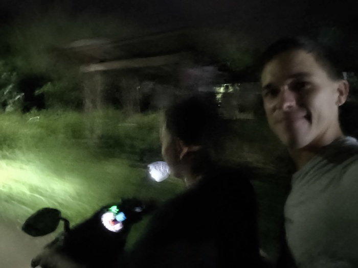 И вот, спустя мгновение... Мы уже несёмся по темной аллее под лёгким дождем. Я вдыхаю свежий воздух и слушаю гомон из джунглей - они тут всё ещё почему-то хорошо сохранены у города. Уцелели.