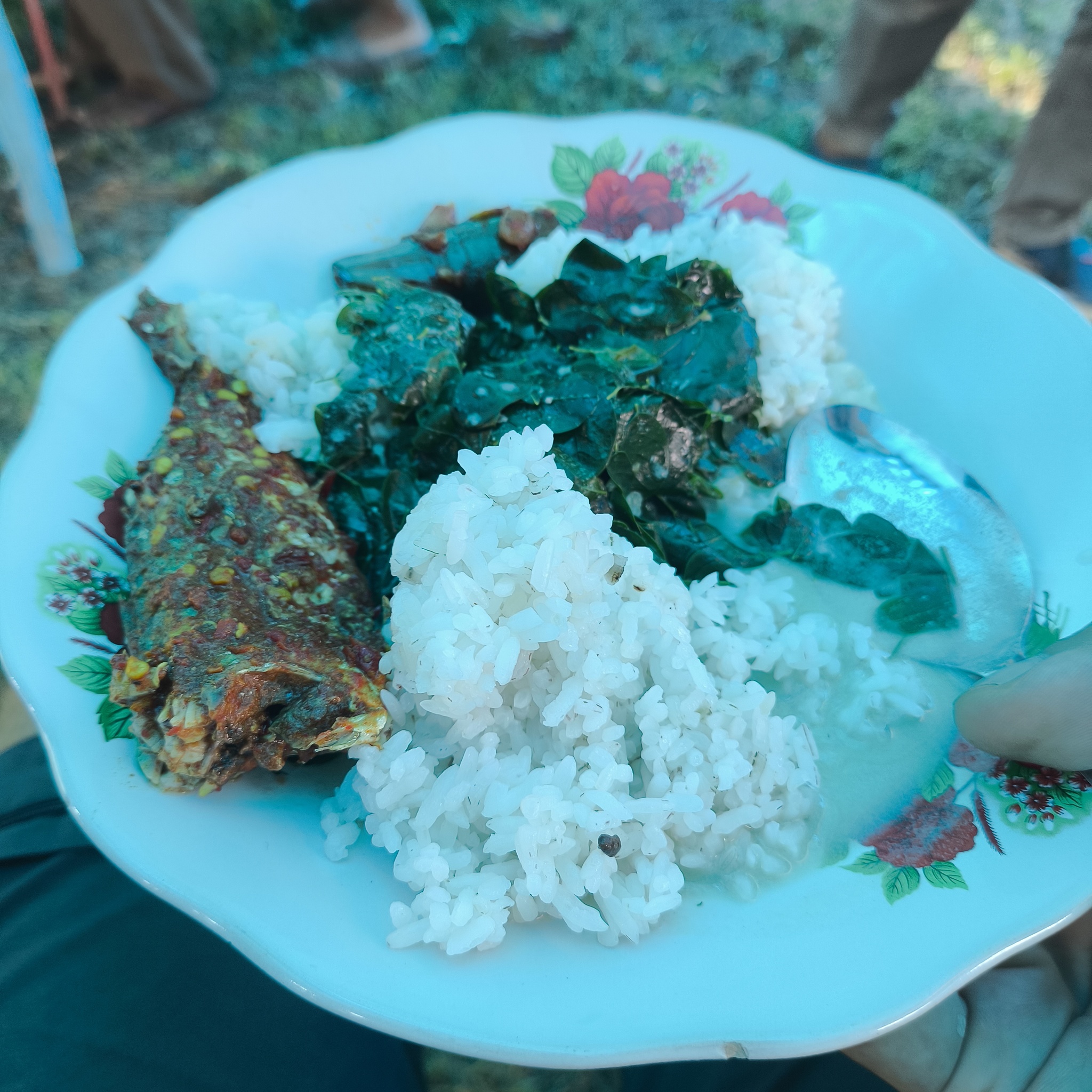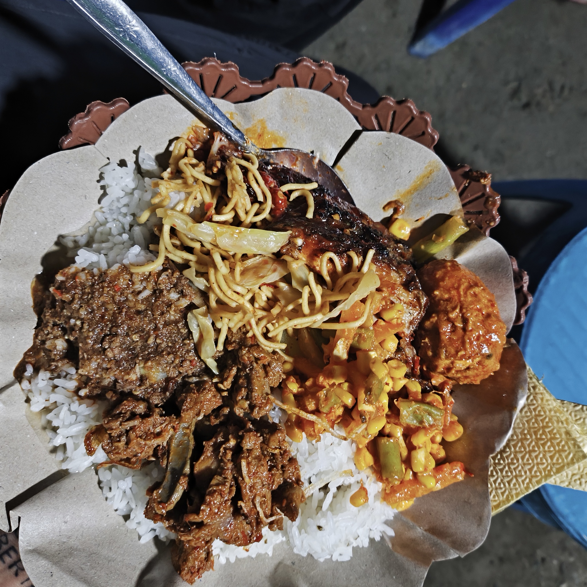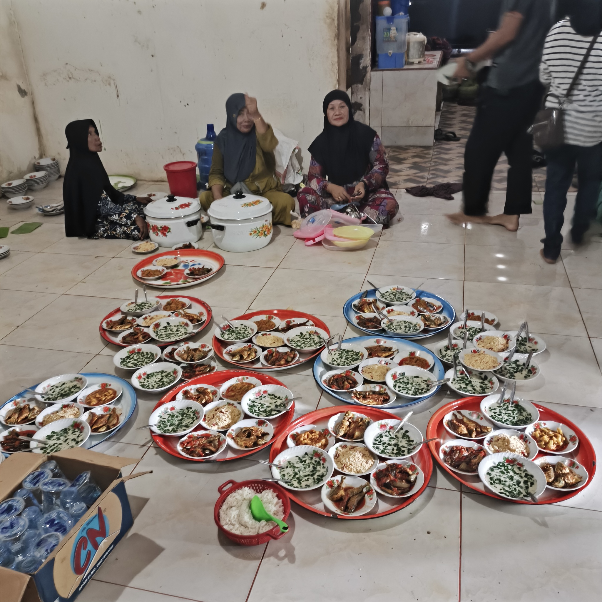 Гости начали прибывать и женщины накрыли аж 3 стола с едой. В этот раз рисом не ограничилось. Тут и говядина (видел, как разделывали двух телят), и какая-то огромная рыба, картофель, овощи, кукуруза, лапша и... Рис, конечно!