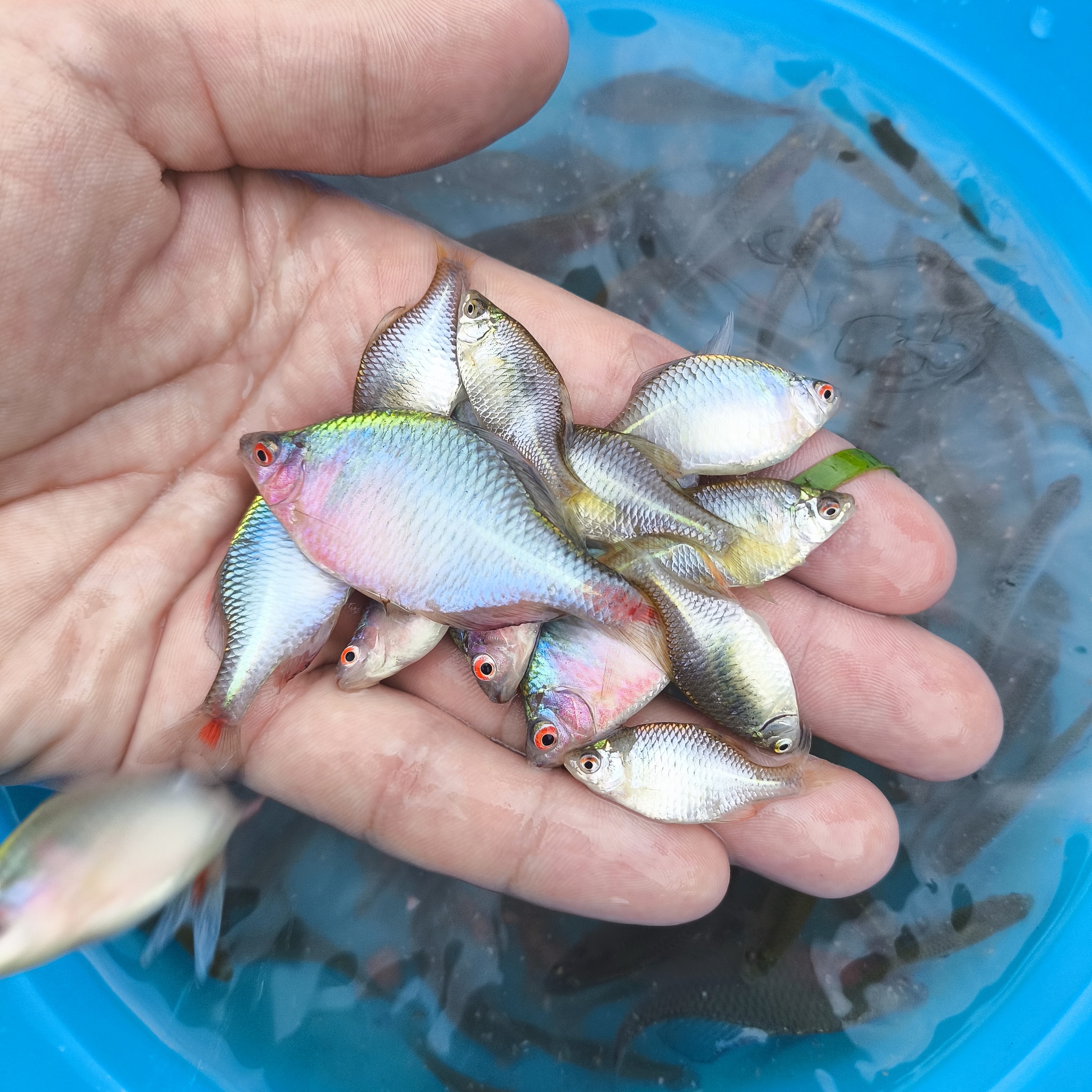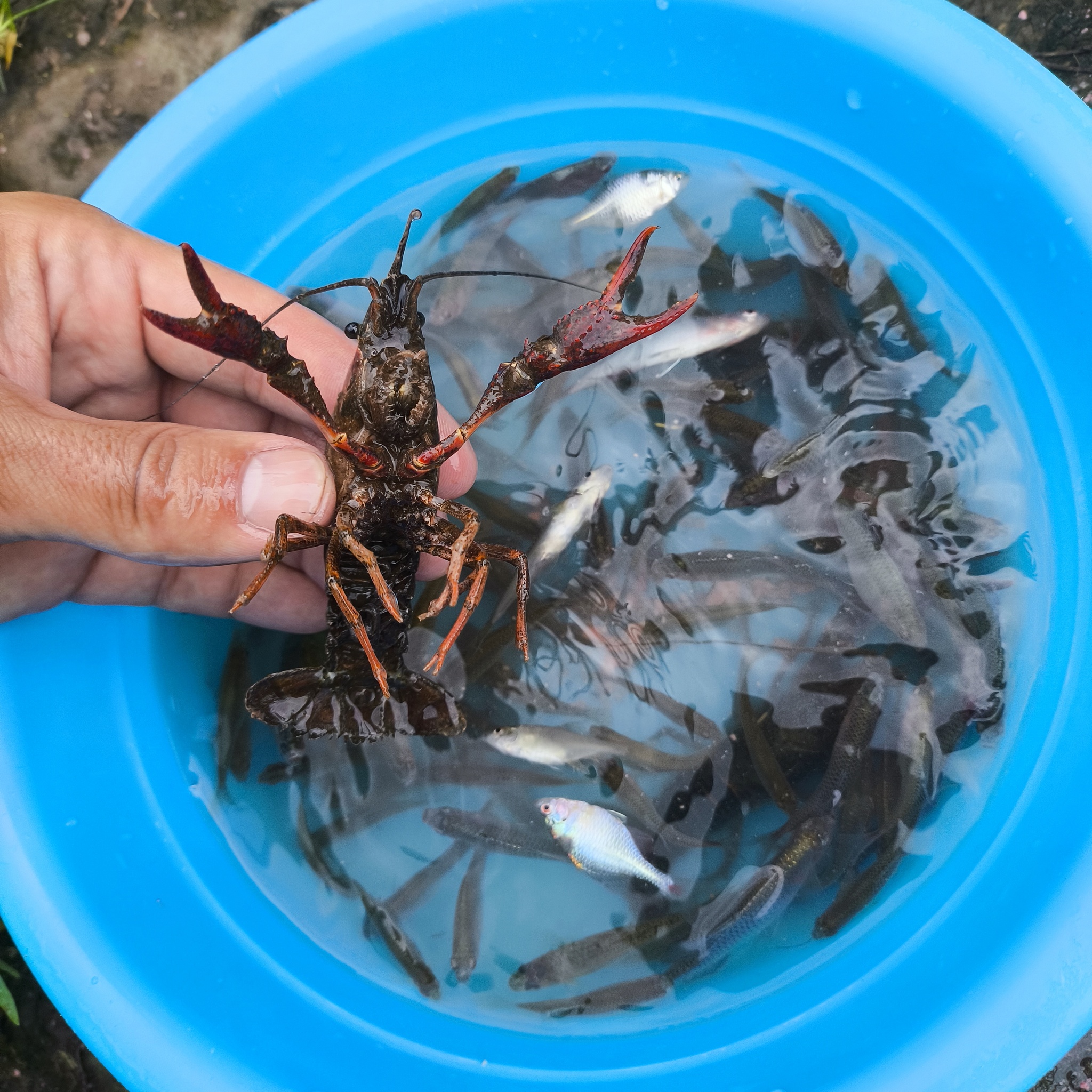 Проверили ловушку. Результат: пара небольших раков и миска радужного оттенка рыбёшек, как раз для мяукающей кошки, теперь то она точно меня полюбит.