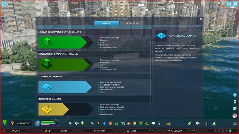Спрос на коммерческие зоны определяется производителями, выпускающими товары на продажу, наличием потенциальных покупателей, а также гражданами, нуждающимися в рабочих местах. Когда промышленные зоны производят товары, им необходимо их продать, чтобы получить прибыль. Поскольку местный рынок всегда более выгоден, они стремятся продавать свои товары в пределах города, что увеличивает потребность в местных коммерческих компаниях.