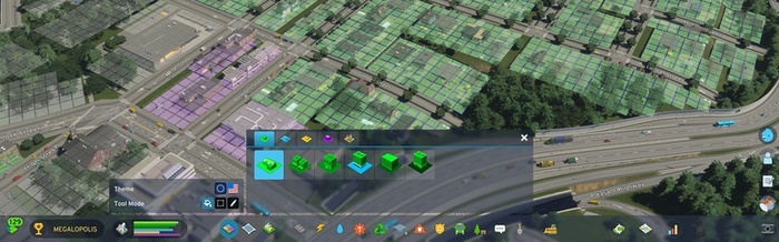 Инструменты зонирования имеют привычные опции: Инструменты "Заливка", "Выделение" и "Закраска". Инструмент "Заливка" заполняет все ячейки непрерывного зонирования выбранным типом зоны. Инструмент Marquee позволяет выделить прямоугольную область любого размера и заполнить ее выбранным типом зоны. А инструмент Paint позволяет создавать очень специфические зоны зонирования, закрашивая по одной ячейке. Хотите создать отдельные жилые зоны размером 2х2? С помощью инструмента Заливка это можно сделать!