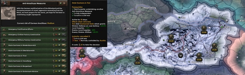 Можно увидеть, что на скриншотах указан уровень риска. Количество доступных решений зависит от этого уровня, начиная от постройки гражданских фабрик и дополнительных гарнизонов и до экстренного призыва, постройки укреплений и увеличения длительности рабочих смен. Риск — это показатель того, насколько близка Германия к завершению фокуса аншлюса. Требования у фокуса были слегка переработаны и теперь используют соотношения снаряжённых людских ресурсов, а не неизменное количество развёрнутых людских ресурсов Германии. Но об этом лучше расскажут Paradox_Danne и ManoDeZombi, так как это больше относится к Германии, чем к Австрии.