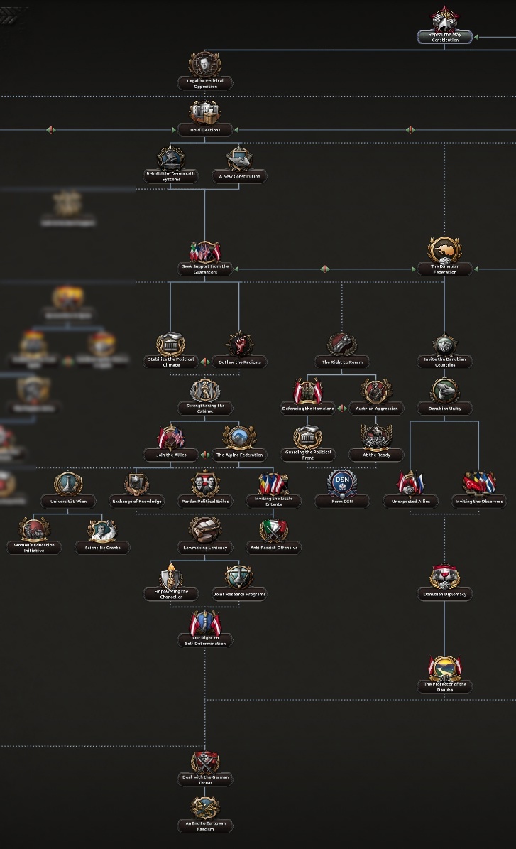 Здесь необходимо сделать довольно очевидную оговорку. Мы все знаем, что случилось с Австрией перед Второй мировой войной: случился аншлюс. Вы, как игрок, должны противостоять этой угрозе, и я верю, что вы сможете, но это будет означать, что если вы выживете, то историческая игра за Австрию не будет такой... ну, исторической что ли. Не только для Австрии, но и для всего остального мира и грядущей войны. Большинство фокусов, которые вы найдёте в «исторической» ветке, основаны на реальных действиях, предпринятых в попытке предотвратить аншлюс, а более поздние фокусы основываются на вероятных амбициях австрийцев в зависимости от их политической позиции.