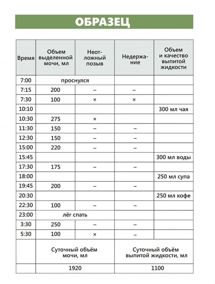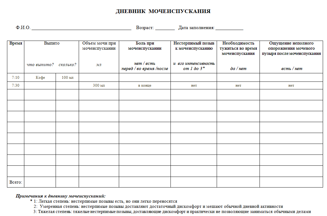 Вести дневник нужно максимально подробно. Не на глаз определять объём мочи, а мочиться в мерную тару. Помочился - измерил и записал, а не вечером вспоминаешь. Мочеиспускание на всякий случай, без желания? Напиши. Был резкий позыв или недержание - отметь.
