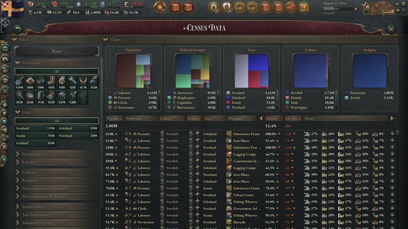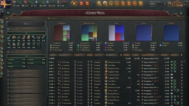 В предыдущем дневнике разработчиков мы рассказали про окно просмотра населения (которое было переименовано в «Данные населения» по предложению пользователя форума Buladelu). С тех пор мы также добавили грамотность, довольство работой и потребности в качестве колонок на второй странице в таблице. Частое предложение о визуализации членства в заинтересованных группах, к сожалению, пришлось отложить из-за трудностей с внедрением и проблем с производительностью. Конечно, как и раньше, вы можете увидеть, какие группы населения входят в ту или иную заинтересованную группу, во вкладке «Население» и на соответствующих страницах заинтересованных групп. В ближайших обновлениях мы думаем сделать подобные окна и для других основных типов данных: сооружений, областей, стран и товаров, которые находятся на самых ранних стадиях планирования.