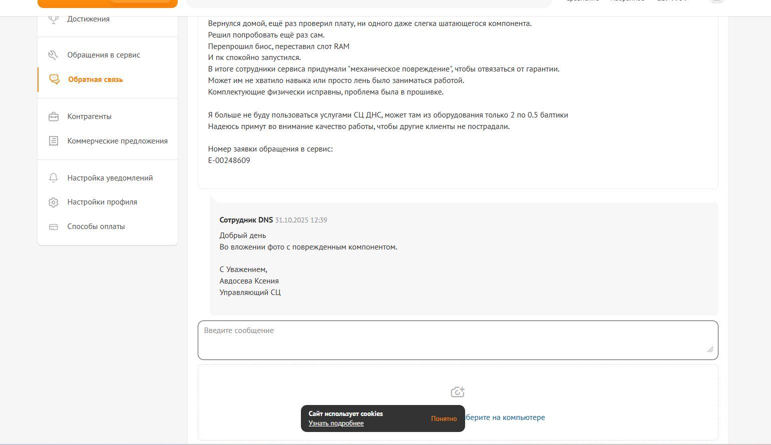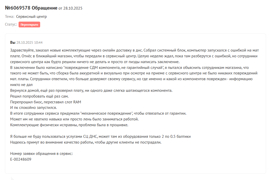 Я позвонил в поддержку DNS, где мне предложили перевести на линию доставки, которая привозила материнскую плату. (провисел на линии 10 минут, никто не ответил).