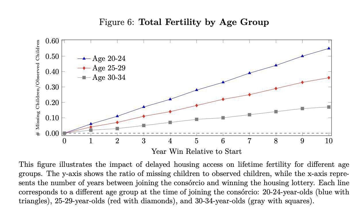 Получение бесплатного жилья увеличивает среднюю вероятность рождения ребенка на 10-летнем отрезке у 20-25-летних на 32 %, а среднее число детей на 33 %, но у людей старше 40 лет рождаемость не увеличивается.
