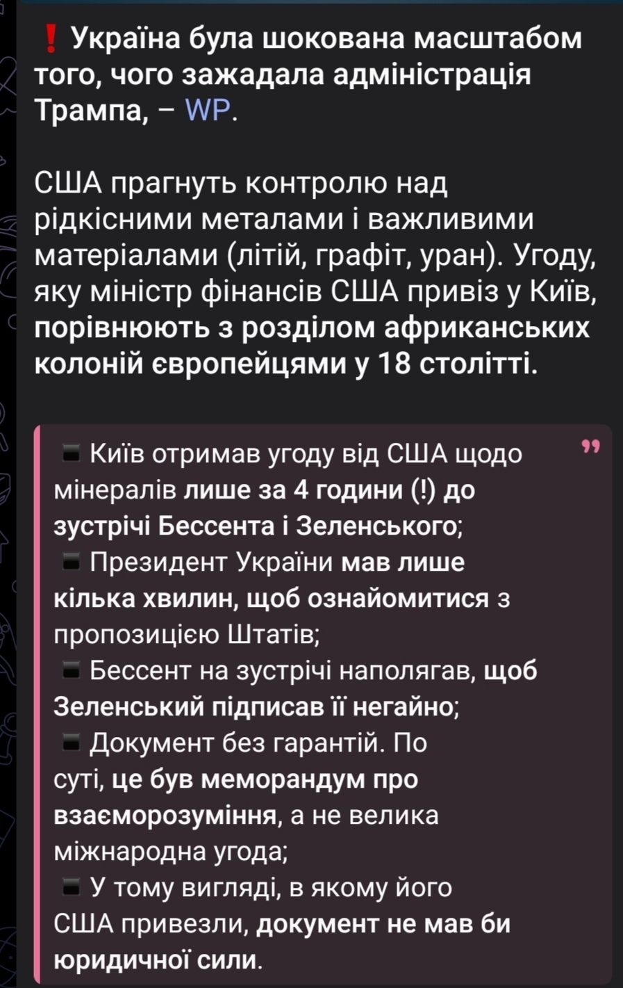 Украина была шокирована масштабом того, чего потребовала администрация Трампа, – WP. США стремятся к контролю над редкими металлами и важными материалами (литий, графит, уран). Соглашение, которое министр финансов США привез в Киев, сравнивают с разделом африканских колоний европейцами в 18 веке.