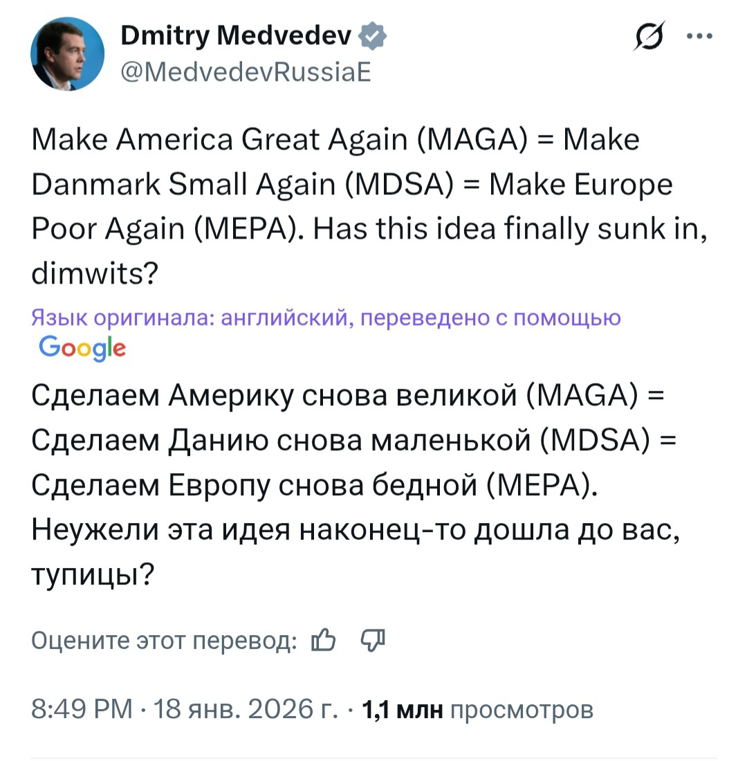 172 morevnaM Политика До этих вряд ли дойдёт 17 часов назад https://x.com/MedvedevRussiaE/status/2012945551428354053 X (Twitter) Скриншот Россия Политика Европа США Дмитрий Медведев Twitter (ссылка) 37 17 6 2 1 Ещё 0