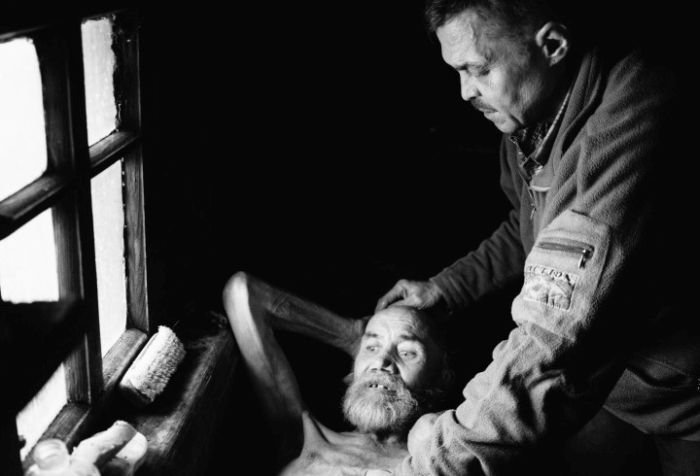 Ивана готовят для переноски в баню. Иван — электрик. После удара током его частично парализовало, Валентина забрала его из больницы в приют