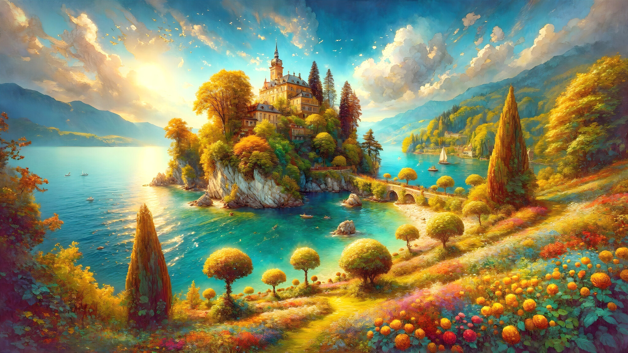 Prompt: Majestic island landscape akin to Isle Mainau, Lake Constance, Germany, envisioned by Jean-Baptiste Monge. Watercolor and ink medium, intricate details capturing a fantasy realm. A breathtaking vista with vibrant colors, reflecting an award-winning masterpiece. The scene is set in radiant sunshine, digitally painted with elegance in 8k resolution, mimicking the texture of oil on canvas. The dynamic lighting enhances the hyperrealistic portrayal, showcasing ultra-detailed elements. The composition follows the golden ratio, exuding a crisp quality akin to acrylic art. The artwork is a blend of pencil sketch finesse and digital painting finesse, creating an enchanting visual experience.