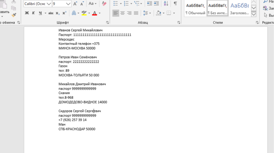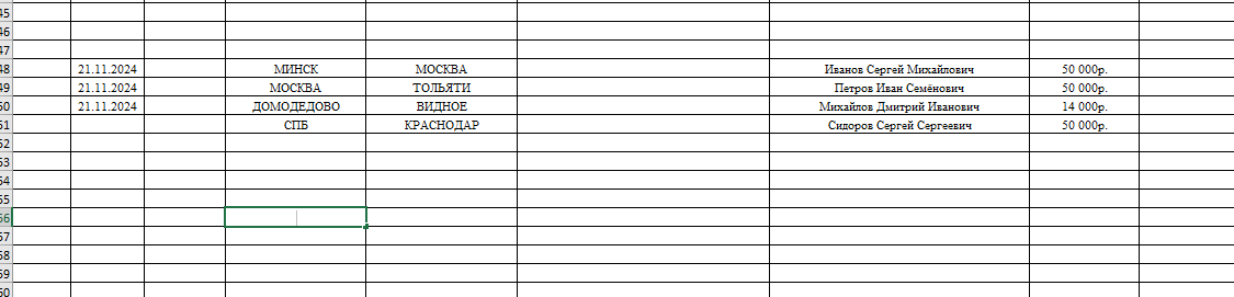 В вордовском файле приходит большой список из фамилий, направлений и стоимости по направлениям. Выглядит примерно так: