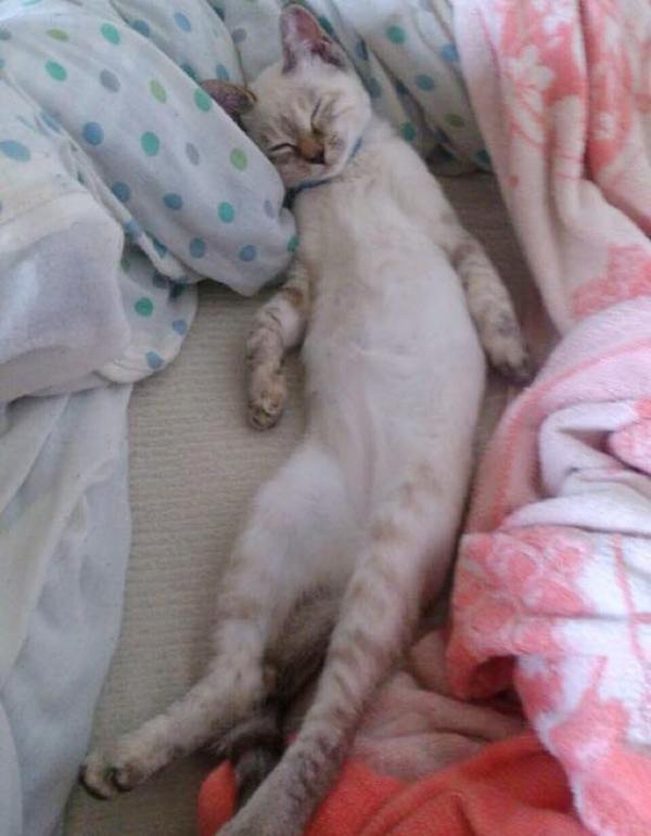 Когда он принес котенка домой, малыш свился рядом с ним в клубок и заснул. Через час он уже полностью привык к новому хозяину и мирно спал у него на коленях. Он быстро освоился в новом доме, оказался живым и подвижным, как и полагается котятам. Через несколько дней он выбрал для отдыха кровать хозяина.
