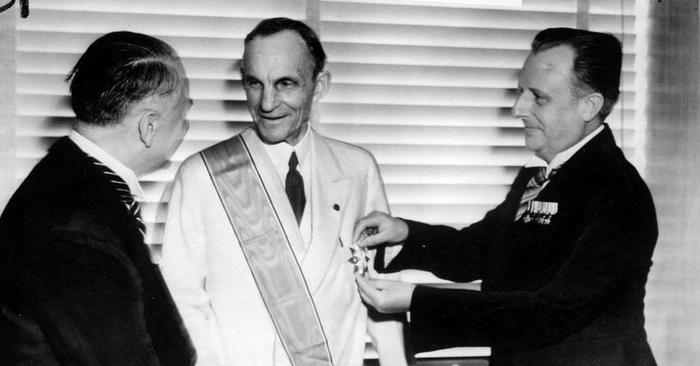 Что же касается человечества, которое любил Генри Форд, то об этом могут подробно рассказать рабочие завода «Форд» в немецком городе Кельне. Во время одной из профсоюзных встреч они показывали российским коллегам фото, на котором «великий гуманист» получает высший орден Третьего Рейха. За что же? За укрепление военной экономики нацисткой Германии. А также за антисемитскую книгу, которую написал добрый дядя Генри Форд.