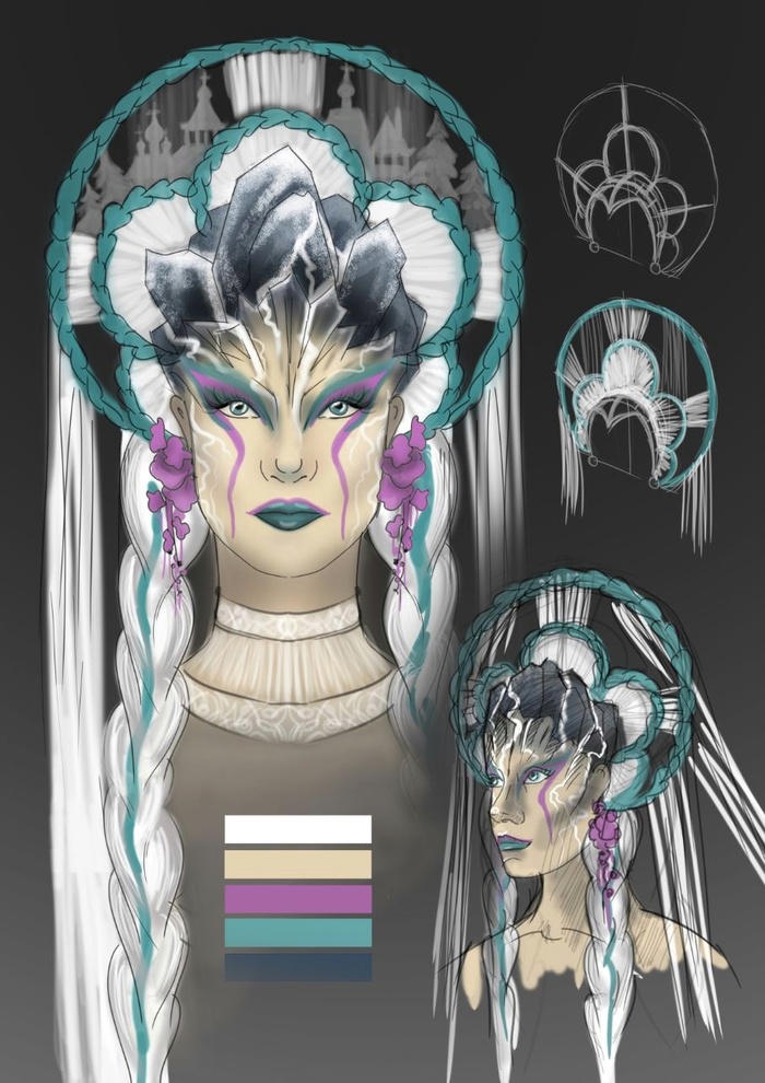 Предыстория. По заданию нужно было создать образ "Царицы Беловодья". У крестьян было поверье, что где-то в горах Алтая, есть такое прекрасное место, где они бы жили хорошо, легко и непринуждённо. Собственно, эта (сейчас уже плохо помню) , мифическая чудо-женщина из русских преданий, как раз и защищала вход в "рай" от богачей и грешников.