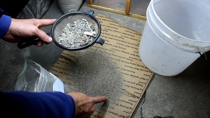 Её следует просеять, отбросив крупные куски, камешки, окурки и прочее. Частицы платины очень маленькие, иногда размером всего в несколько атомов, так что фильтровать следует как можно тщательнее: через кофейный фильтр.