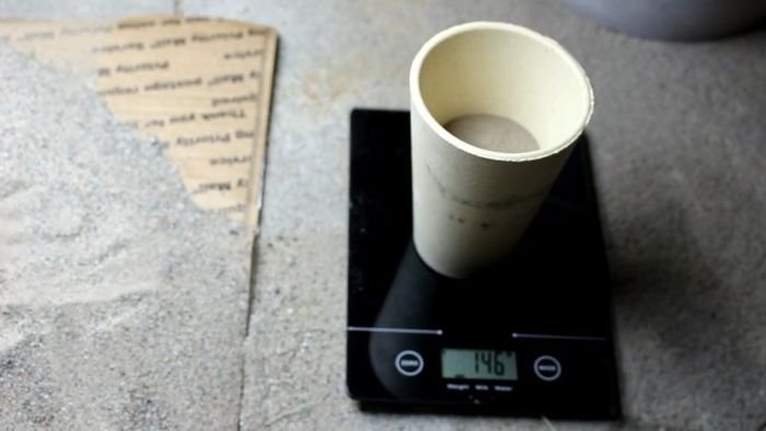 Самые мелкие отфильтрованные частички засыпаем в стакан и взвешиваем. У Артура получилось 146 граммов пыли: это просто для первого испытания. Чтобы сделать настоящее платиновое украшение, придётся собрать больше пыли.