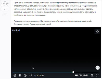 Прям сама написала, и слова, и музыку.Я активно принимала участие вмешивалась в создание слов (старалась учесть замечания, про глагольные рифмы и всё остальное). В создание музыки нет, поскольку абсолютно ничего в этом не понимаю. Аранжировку и запись помог сделать взрослый музыкант. В это тоже не вмешивалась, они на своём колдунском что-то обсуждали и пробовали, я в уголочке тихо сидела.