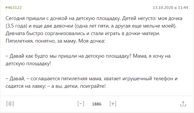 Сегодня было. Пришли с дочкой на детскую площадку. Детей не густо - моя дочка (3,5 года) и ещё две девочки (одна лет 5, а другая ещё мельче моей). Девчонки быстро сорганизовались и стали играть в дочки-матери. Пятилетняя, понятно, за маму. Моя дочка:
