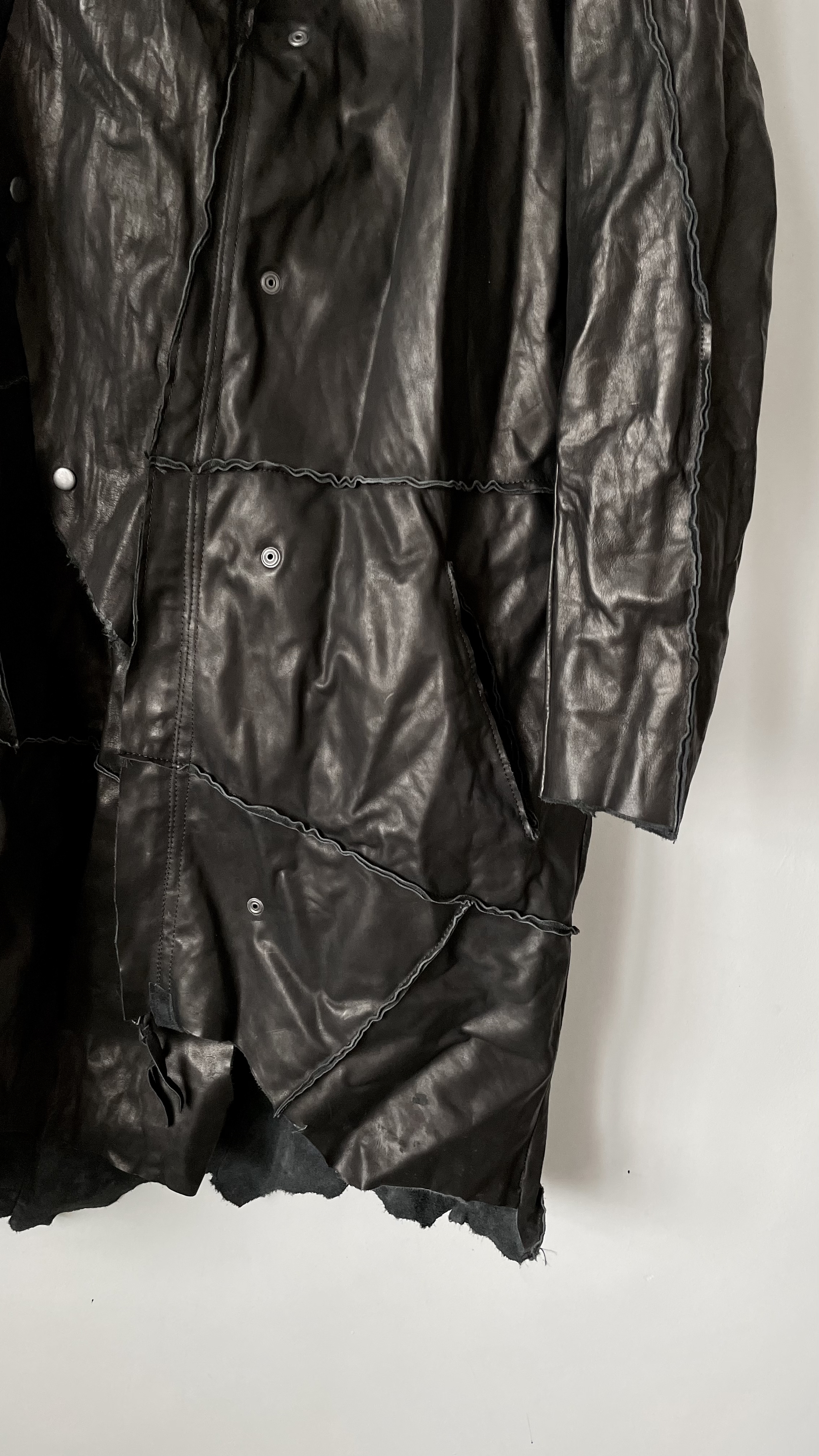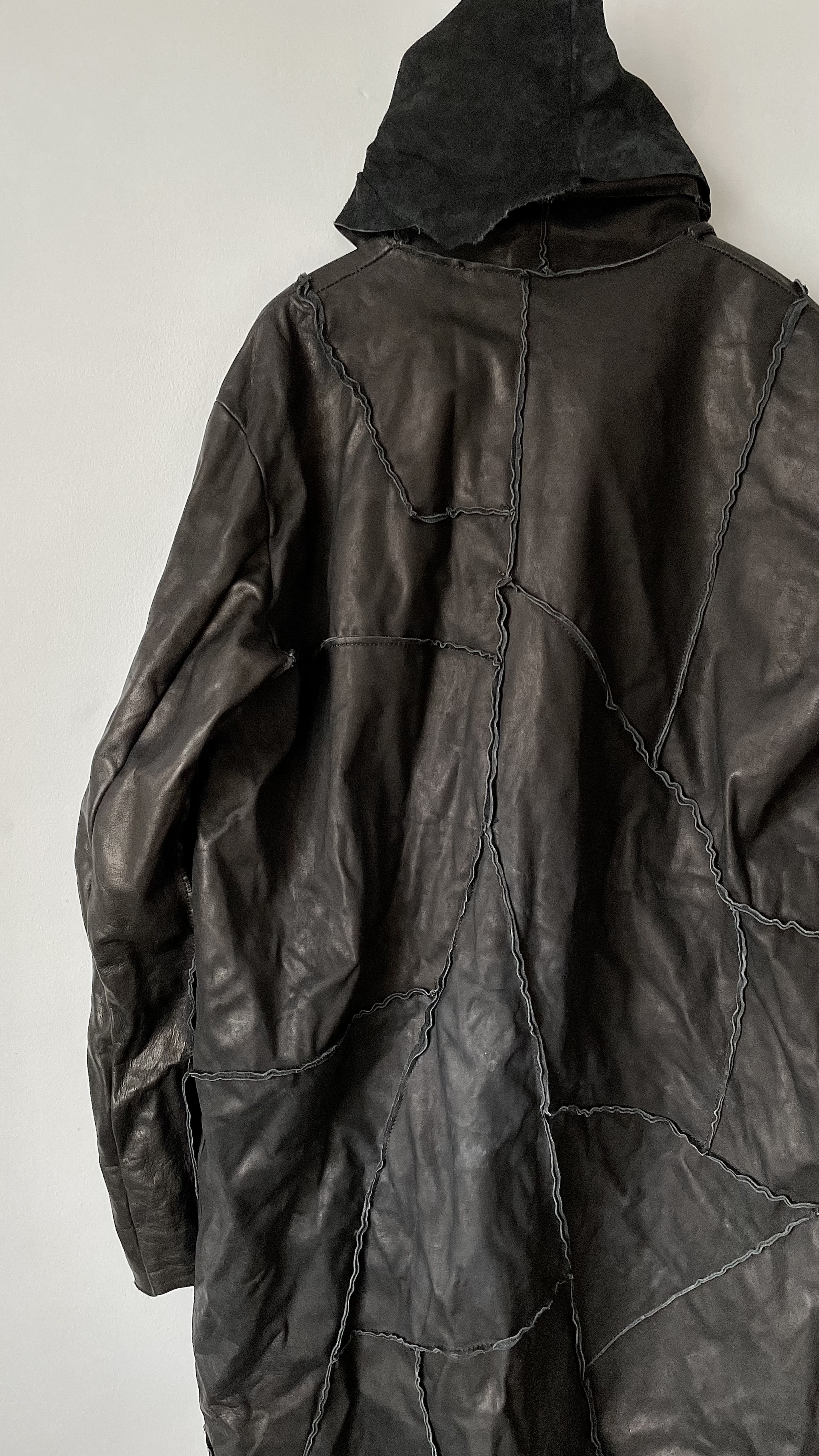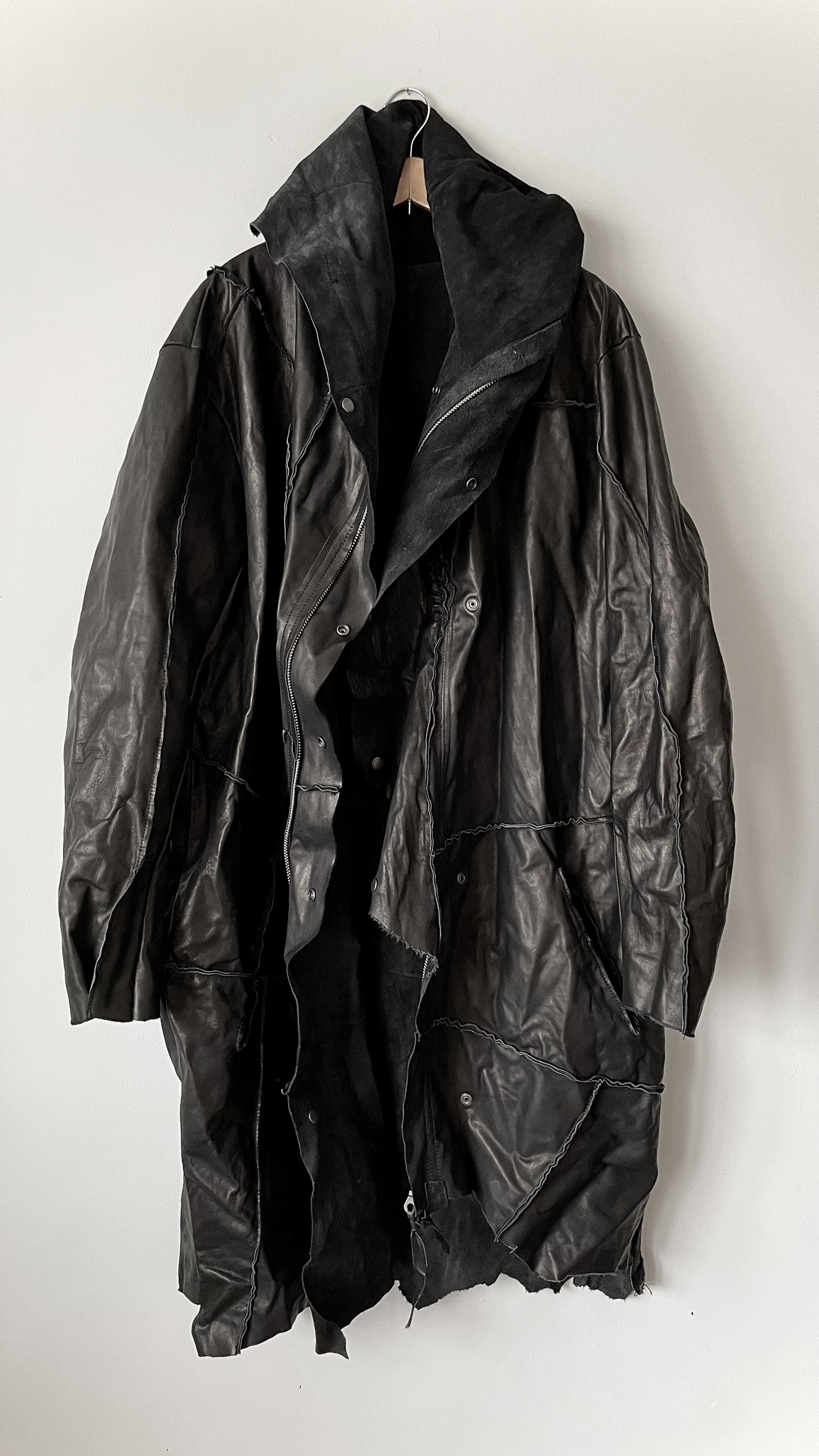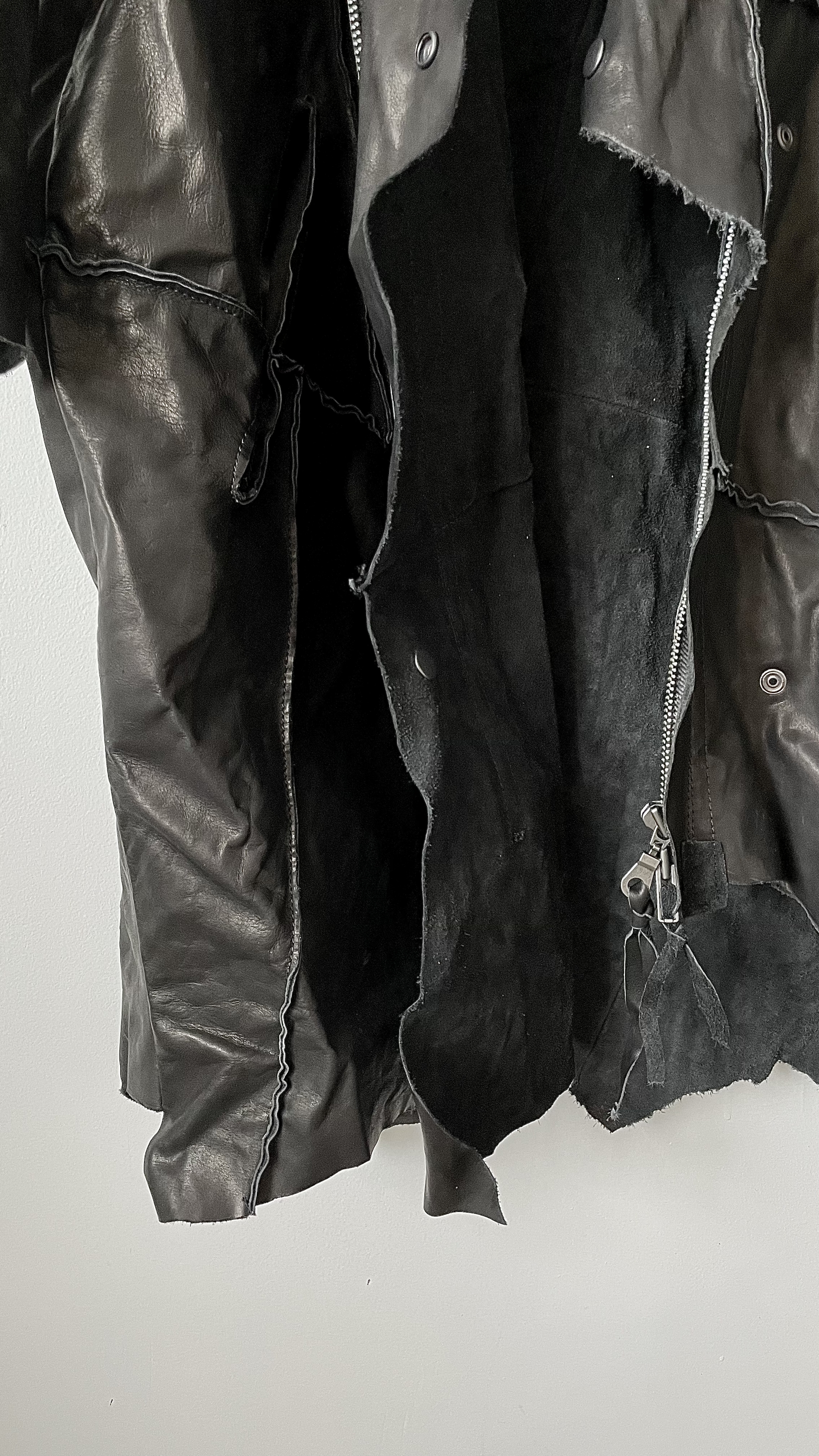Асимметричный крой деталей и сборка в пэчворк стиле швами наружу на внешней стороне.