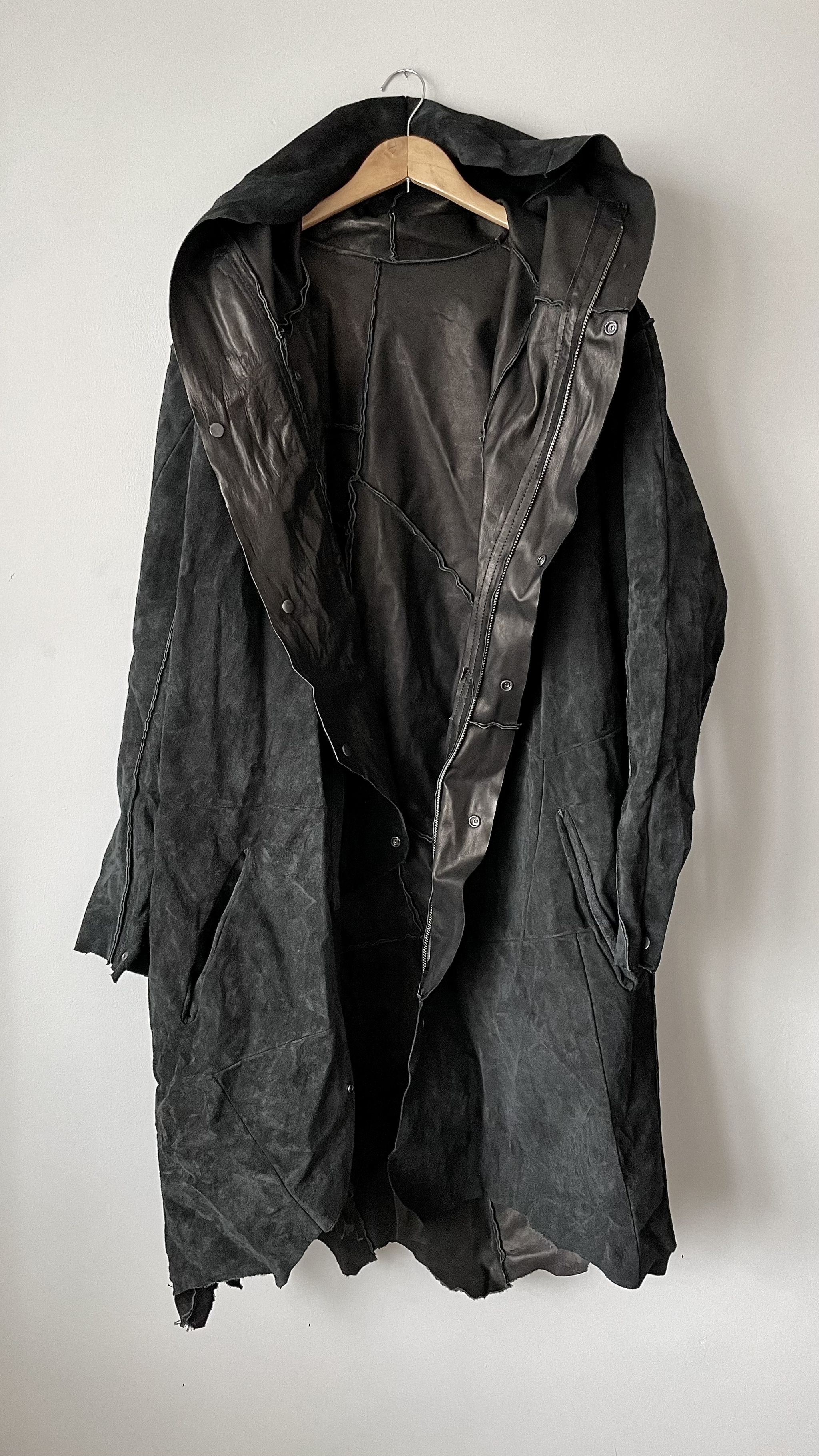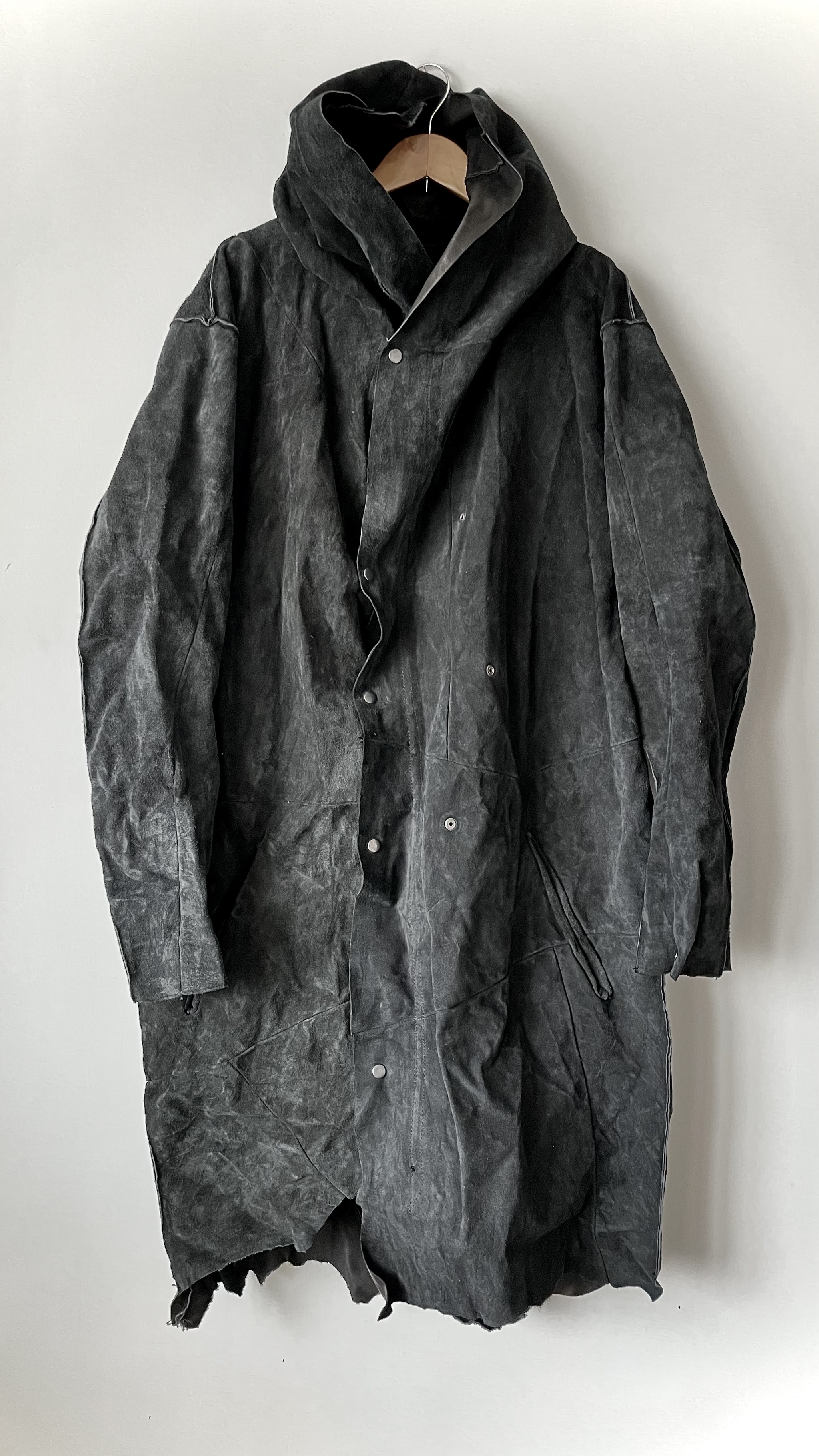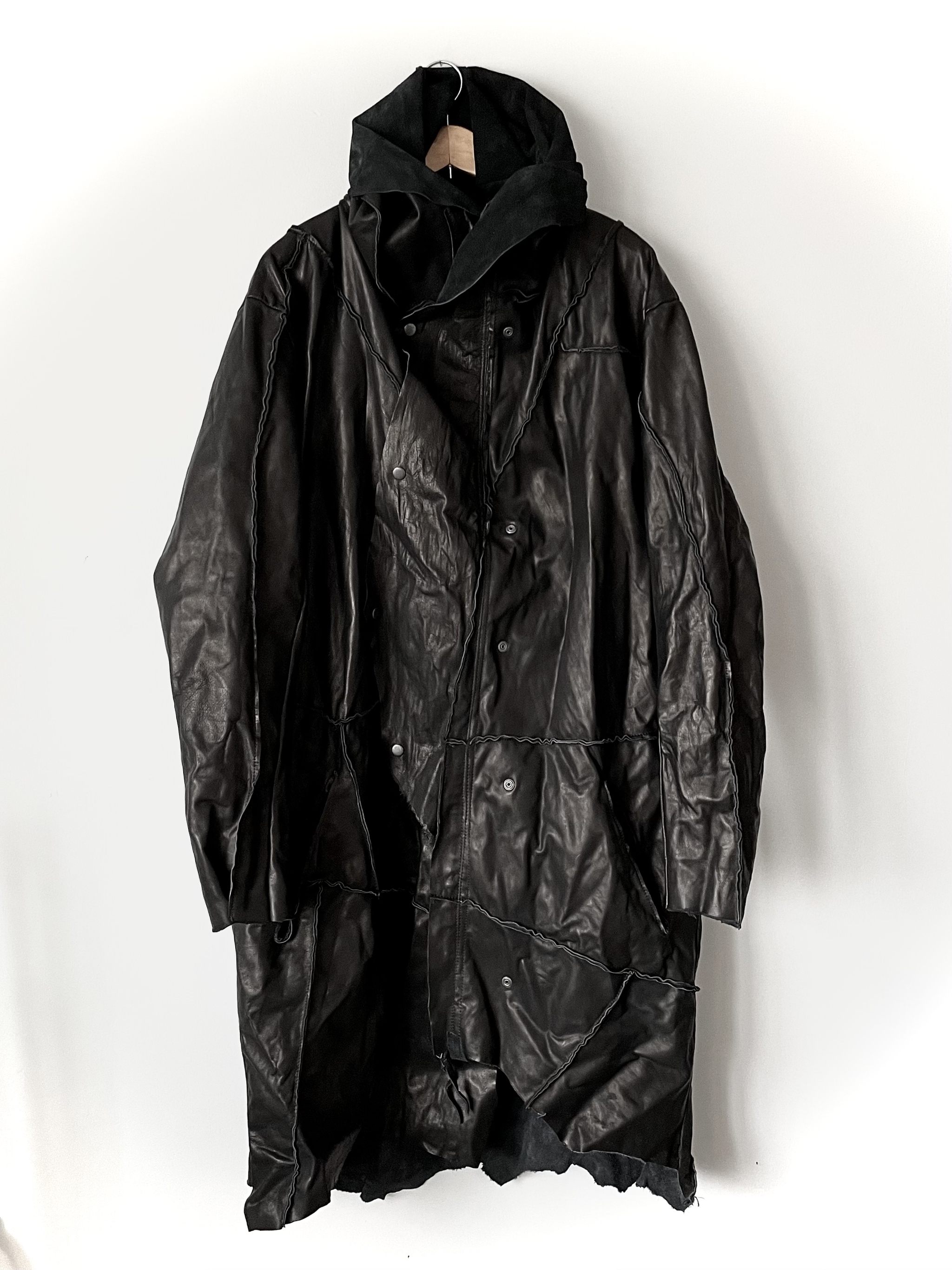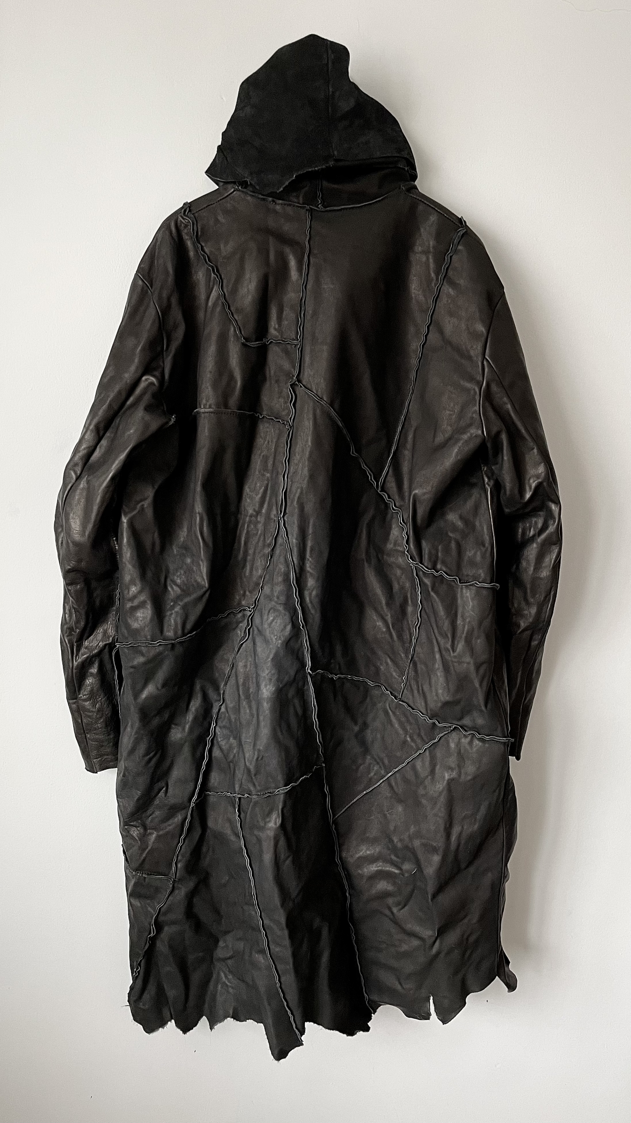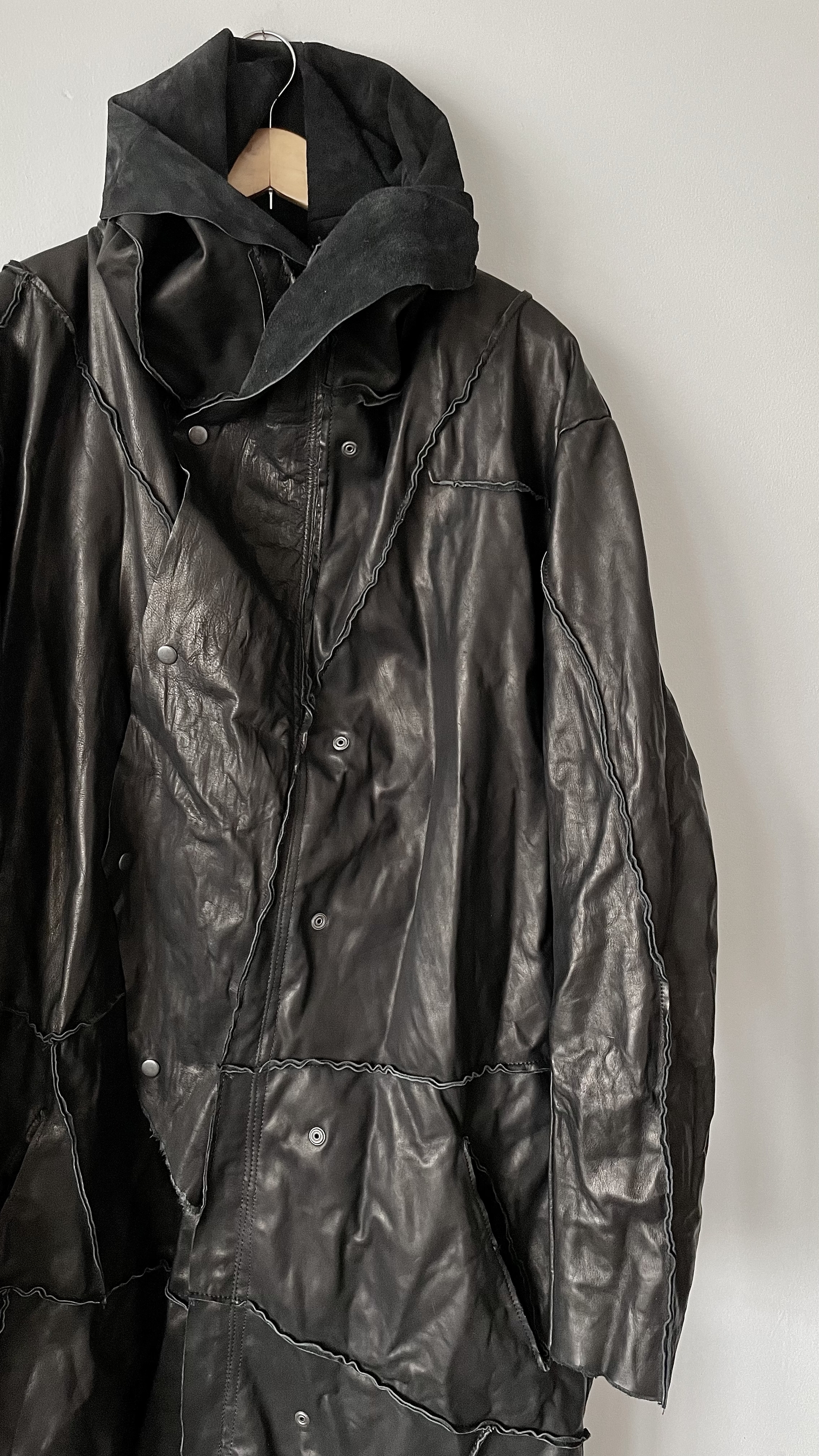 Асимметричный крой деталей и сборка в пэчворк стиле швами наружу на внешней стороне.