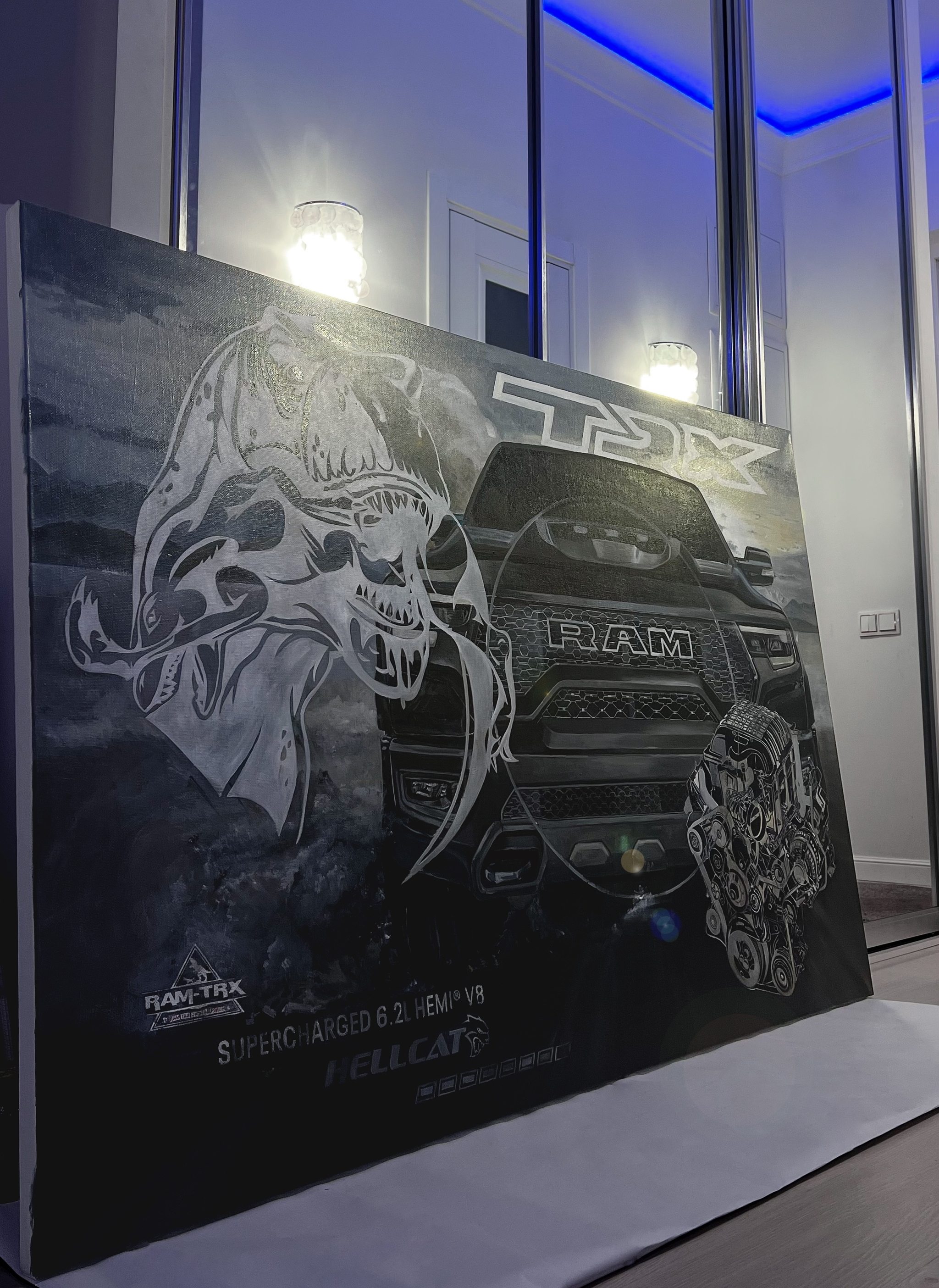 Пришлось подсматривать за чужими RAM на драйв2, а затем я обратилась за фотографиями в премиальный автосервис Level Performance, где как раз стоял RAM, который мне нужен. Благодаря их фотографиям мне удалось сразу, без чертежей, написать маслом и проработать абсолютно все необходимые детали автомобиля.