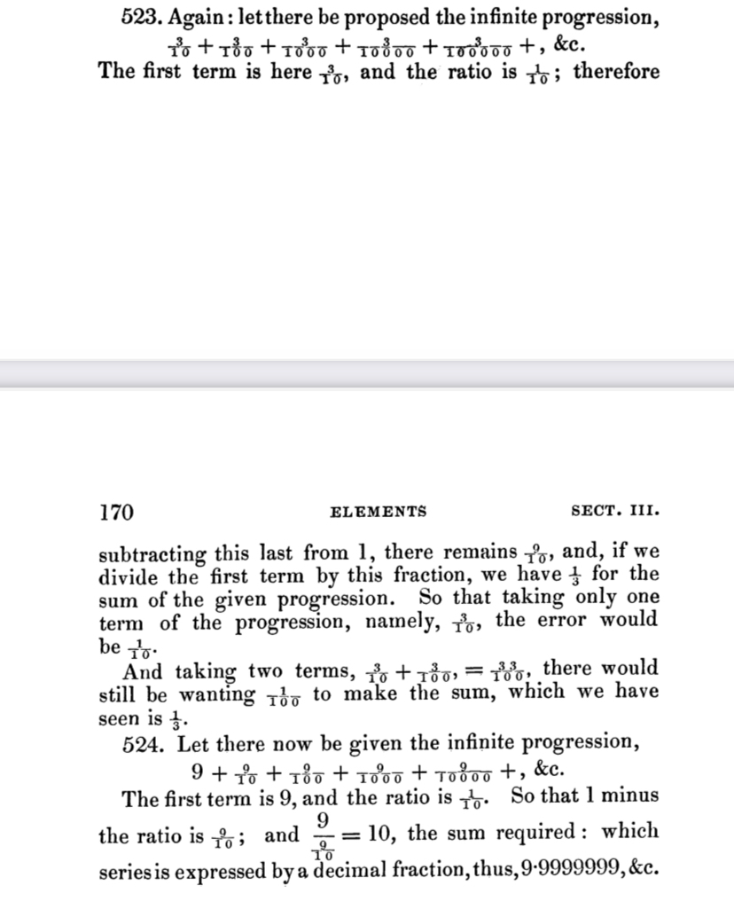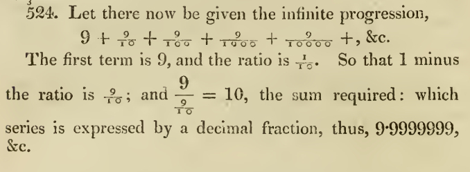 Такое доказательство (об эквивалентности чисел 10 и 9,999…) было опубликовано в 1770 году Леонардом Эйлером в издании «Элементы алгебры[англ.]»[2].