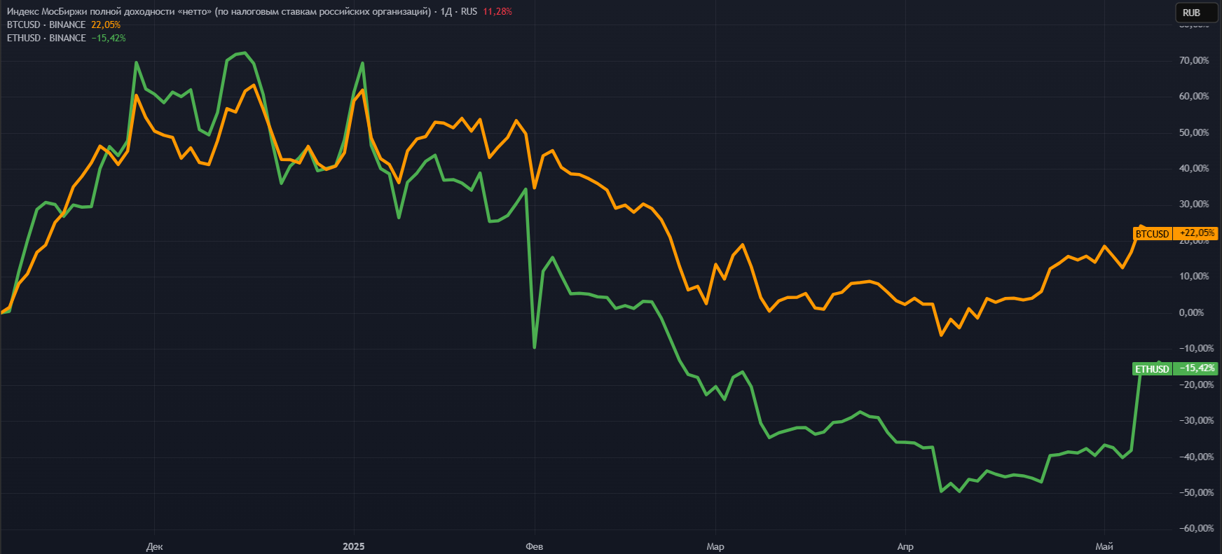 Однако, с начала инаугурации Трампа две основные криптовалюты начали скачкообразное падение, в основном из-за его заявлений и действий относительно торговых пошлин на импорт товаров в США, а также начатой торговой войны с Китаем, показав локальные минимумы в апреле: 6,268 млн ₽ за Биткоин, тем самым вернув нас в октябрь 24 года, и 119 тыс ₽ за Эфириум — отбросив в март 2023.