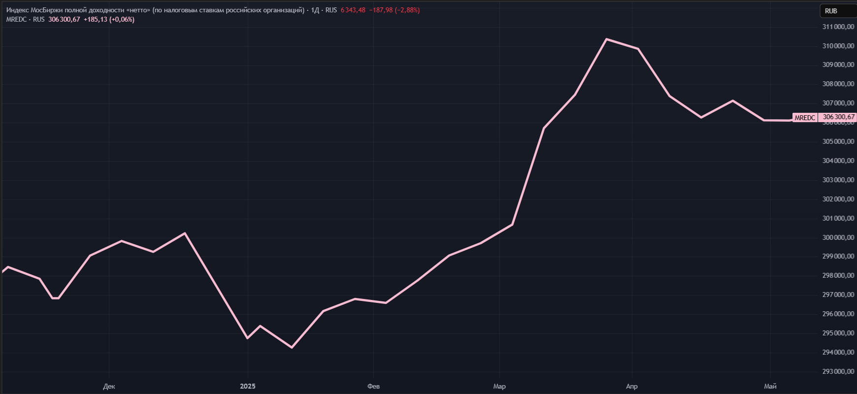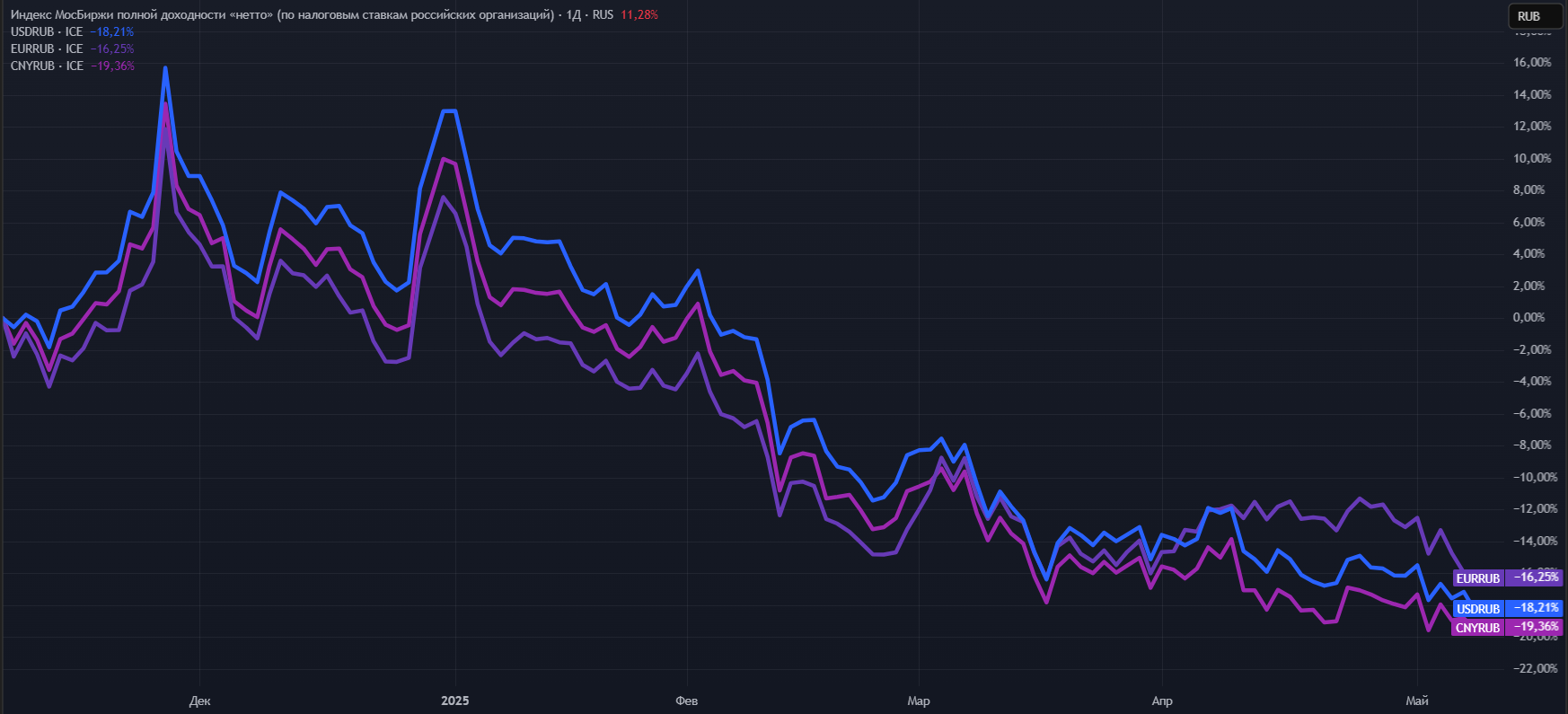 Как видно из графика американский и мировой фондовый рынок практически повторяют колебания друг друга, в отличии от российского. Так, на фоне эскалации торговых войн, инфляционных рисков, а также заявлений Трампа о возможной рецессии — SPXTR и ACWI с начала 2025 года уверенно пошли на снижение, добравшись до локального дна, уровня января 2024 года.